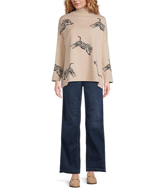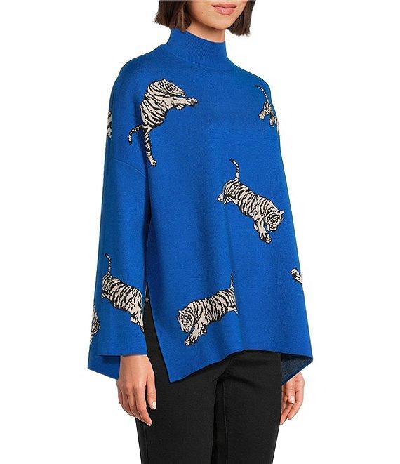 From Ali Miles, this sweater features: Jacquard knit fabrication Mock neckline Long sleeves Tiger jacquard print Straight hem with side vents Pullover construction Approx. 27" length Viscose/polyester/polyamide Machine wash cold Imported.