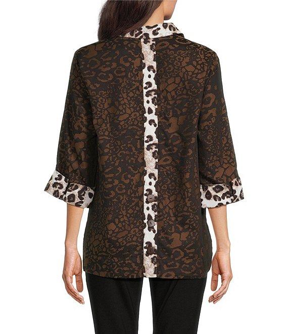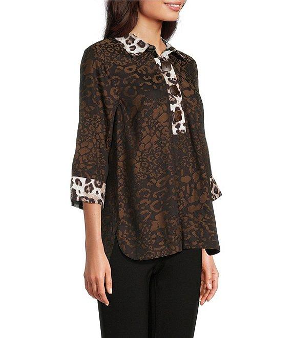 From Ali Miles Petite, this tunic features: Woven fabrication Point collar 3/4 cuff sleeves Animal print Contrast trim at collar and sleeves Back button detail Hi-low hemline with side vents Pullover construction Approx. 25" front length, 26" back length Cotton Machine wash cold/tumble dry low Imported.