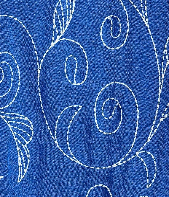From Ali Miles, this top features: Woven fabrication Allover paisley leaf embroidery V-neckline 3/4 sleeves Embroidery motif Straight hem with button detail Pullover construction Approx. 26" length Rayon/nylon, embroidery: polyester Machine wash cold/tumble dry low Imported.