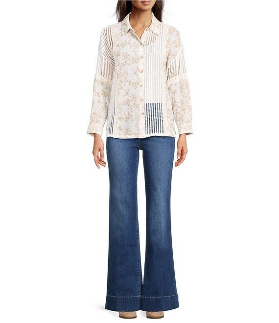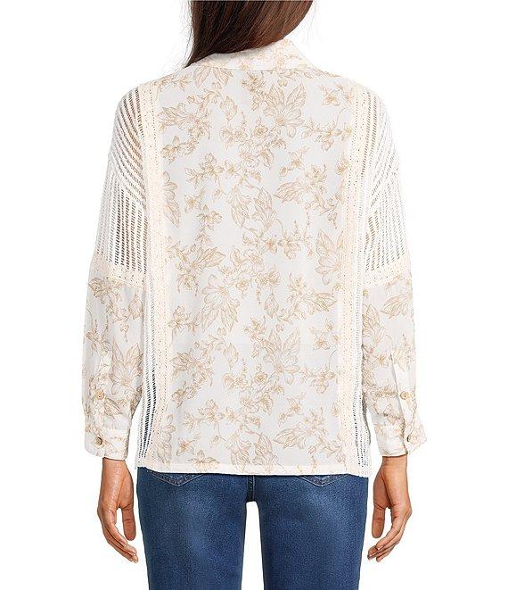 Ali Miles Woven Floral Lace Panel Insets Point Collar Long Roll-Tab Sleeve Button Front Tunic