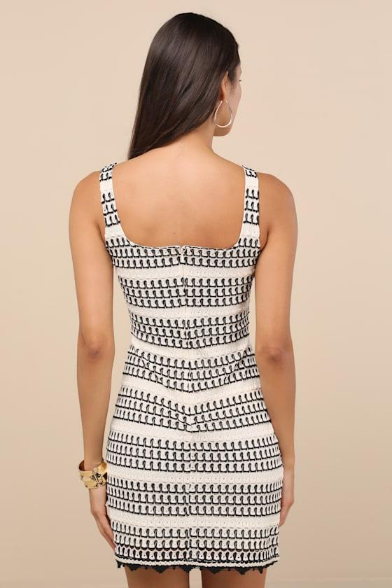 Summer vacay is calling, and this chic 'n' breezy mini dress is answering, crafted with an intricate crochet knit and a unique color block design. The figure-skimming silhouette falls from slender straps into a collarbone-flaunting square neckline, while crochet lace detailing creates a vintage-inspired scalloped effect at the hem. Hidden back zipper/clasp.