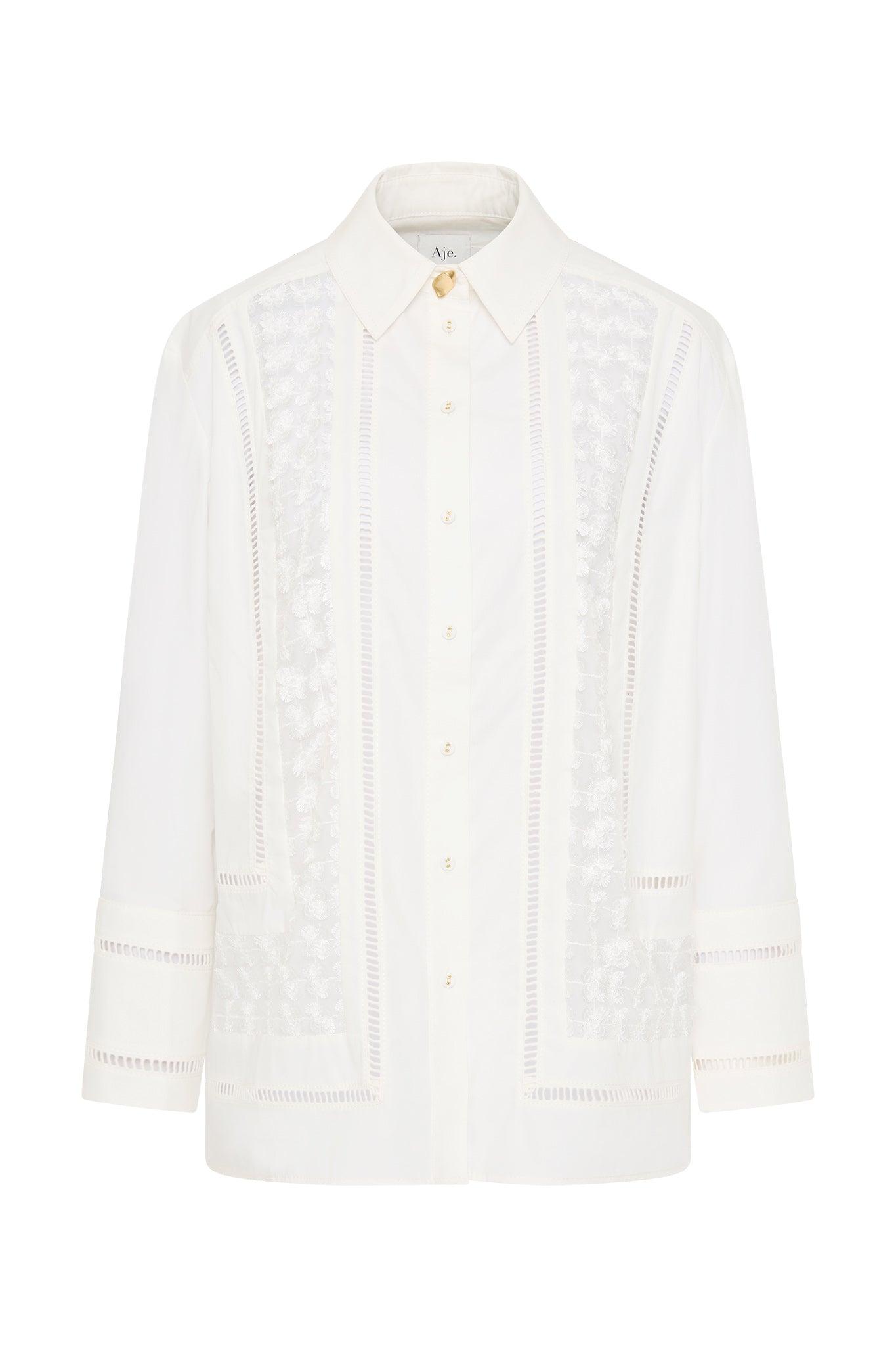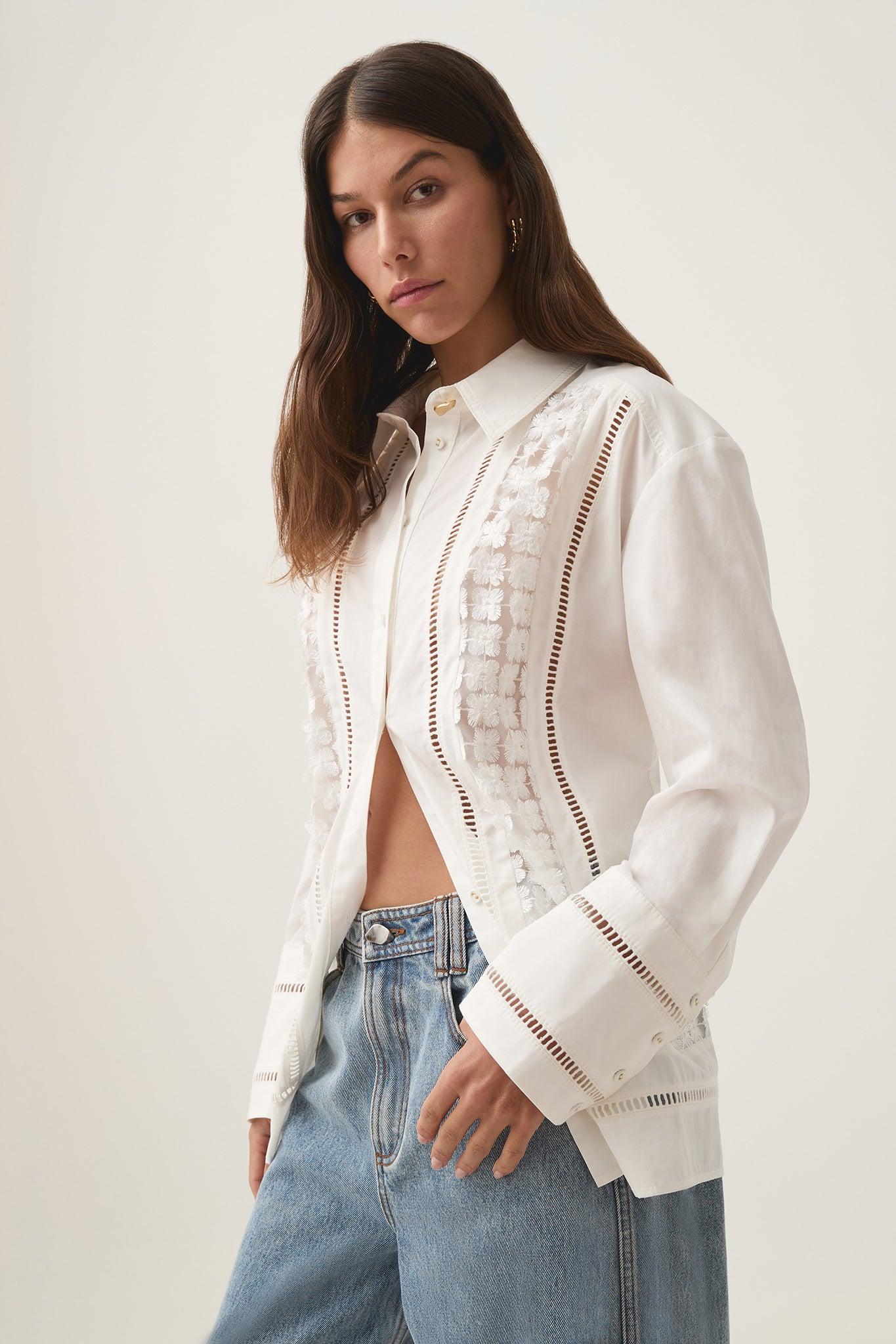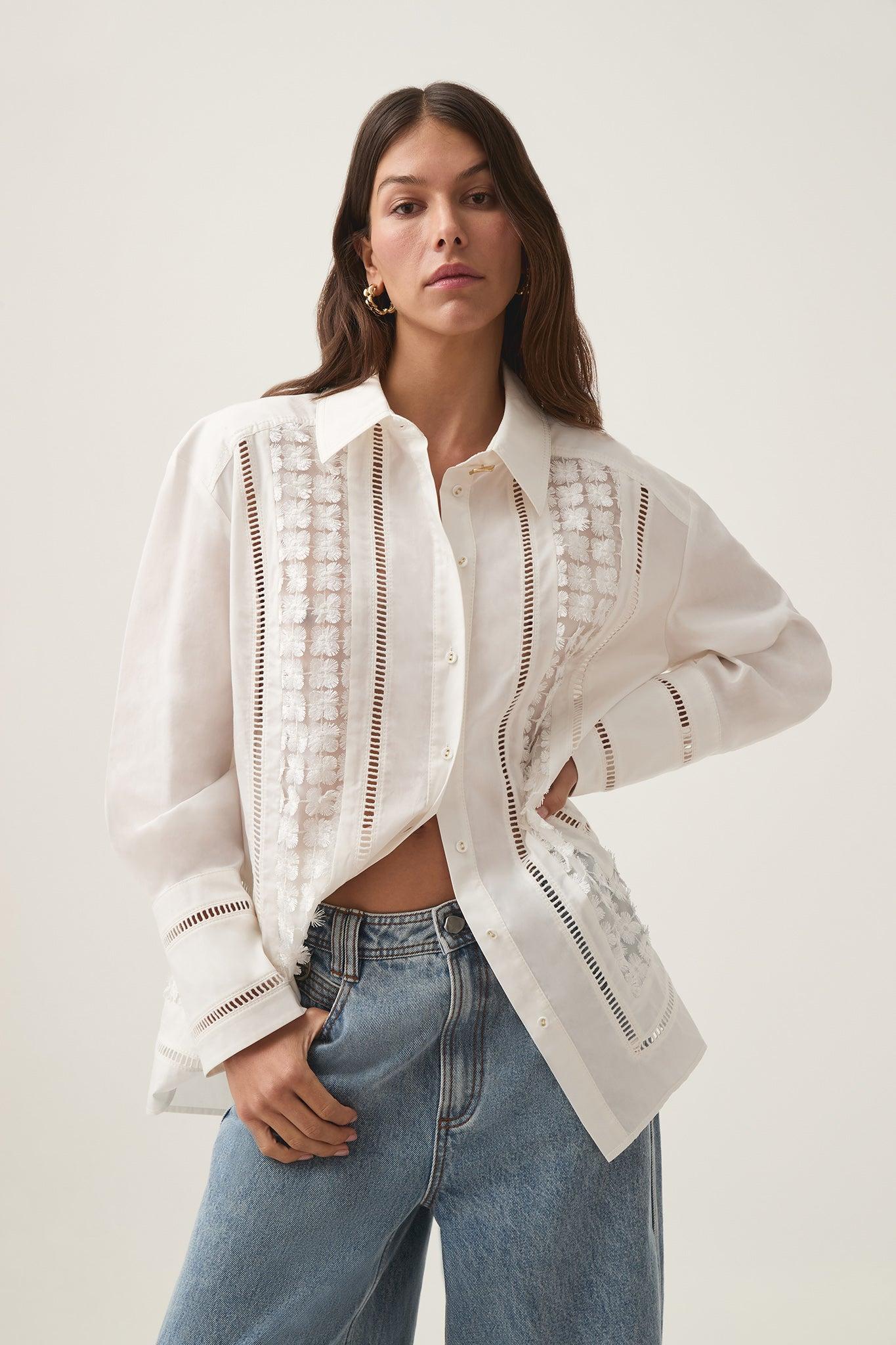 PRODUCT DETAILS Women’s shirt Oversized silhouette Shirt collar with gold accent button Lace panel detailing at front and back Front button placket Straight sleeves with exaggerated cuffs Trim detail throughout Shop All Tops SIZE AND FIT Model wears a size AU 8/S Model: 172cm/5’7 Bust: 77cm Waist: 58cm Hips: 88cm FABRICATION 100% Cotton