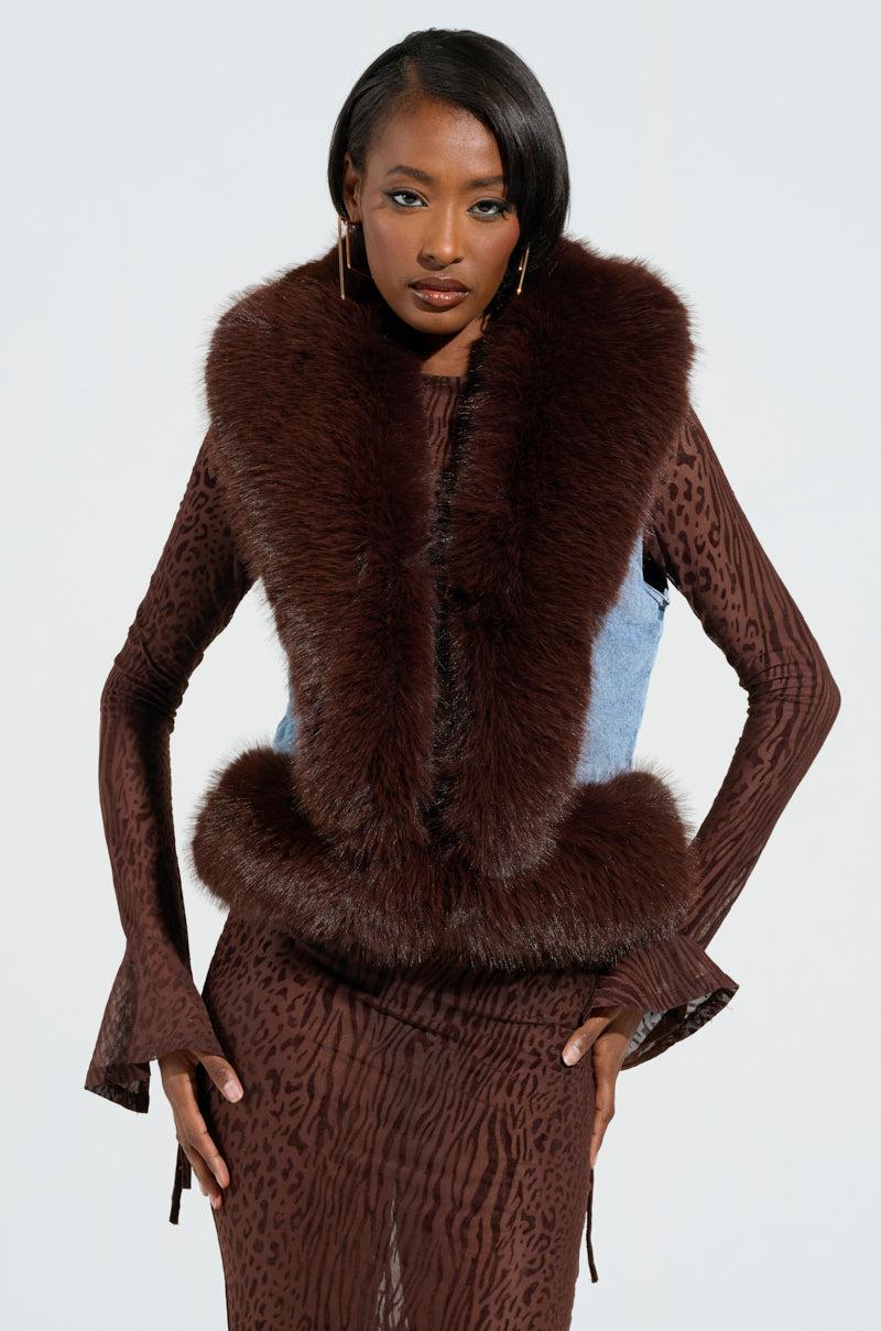 Y2K luxury vibes in The AKIRA Label Alicia Fur Trim Denim Vest. This sassy outerwear piece is crafted from a non-stretch light wash denim base and features a paneled construction, a luxurious removable wide fur lapel collar with a concealed denim notch lapel collar underneath, a sleeveless design, coordinating faux fur bottom trim, and a cozy sherpa inner lining. Complete with a concealed faux gold metallic front zipper closure, a fitted silhouette, and a cropped length. Style with a ribbed mock neck sweater, flared denim, and leather booties for a chic finish. - Fabric: 75% Cotton 25% Polyester, Fur: 100% Polyester- Hand Wash Only- Little to No Stretch- Imported (all measurements taken from size small)- 20” Shoulder to Hem- 14” Shoulder to Shoulder Product ID: 440132