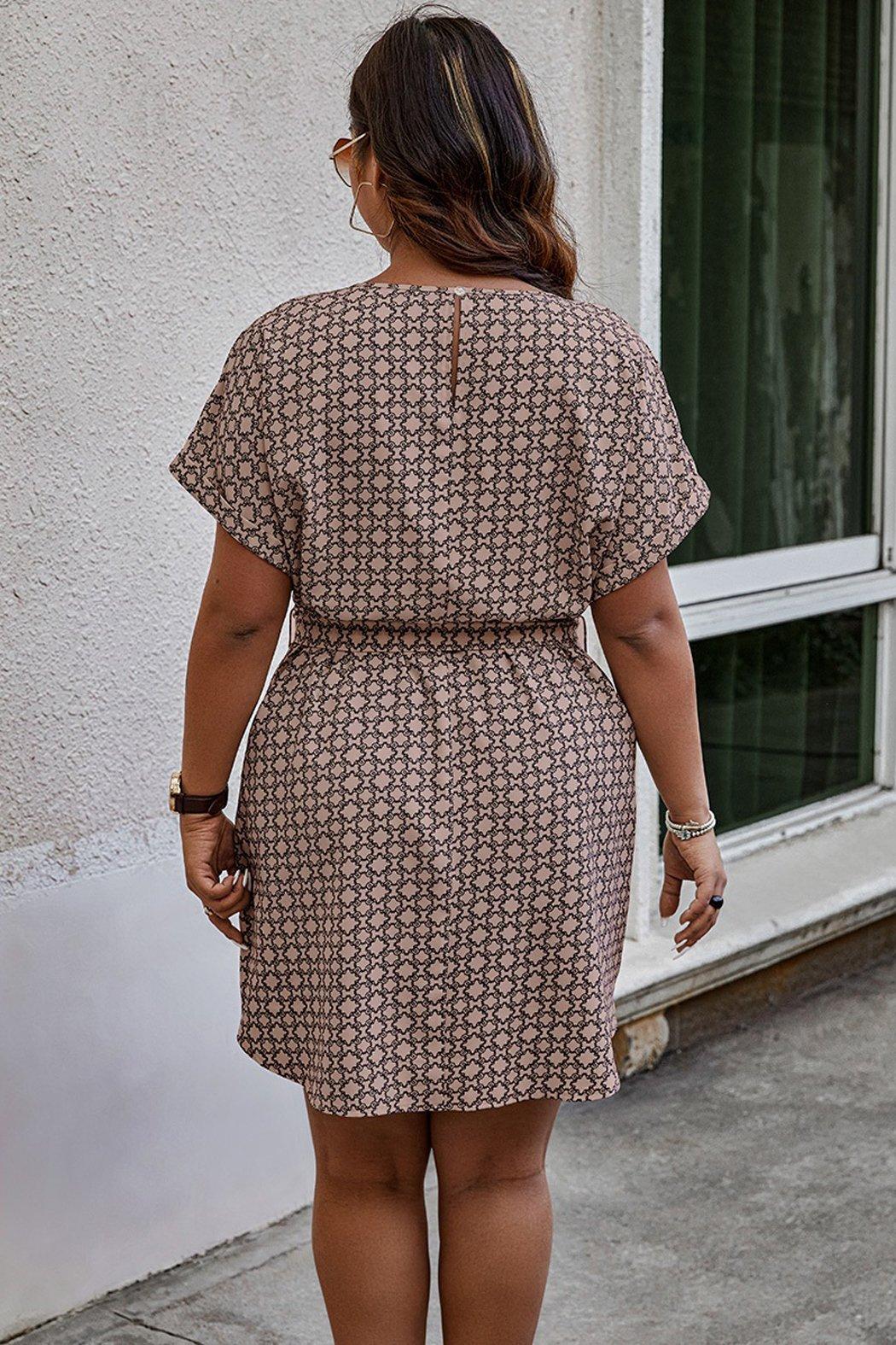 In a rich taupe with geometric black print, this round neck mini dress features a dolman short sleeve and a belted tie waist. Perfect for any occasion from work, to drinks with friends.