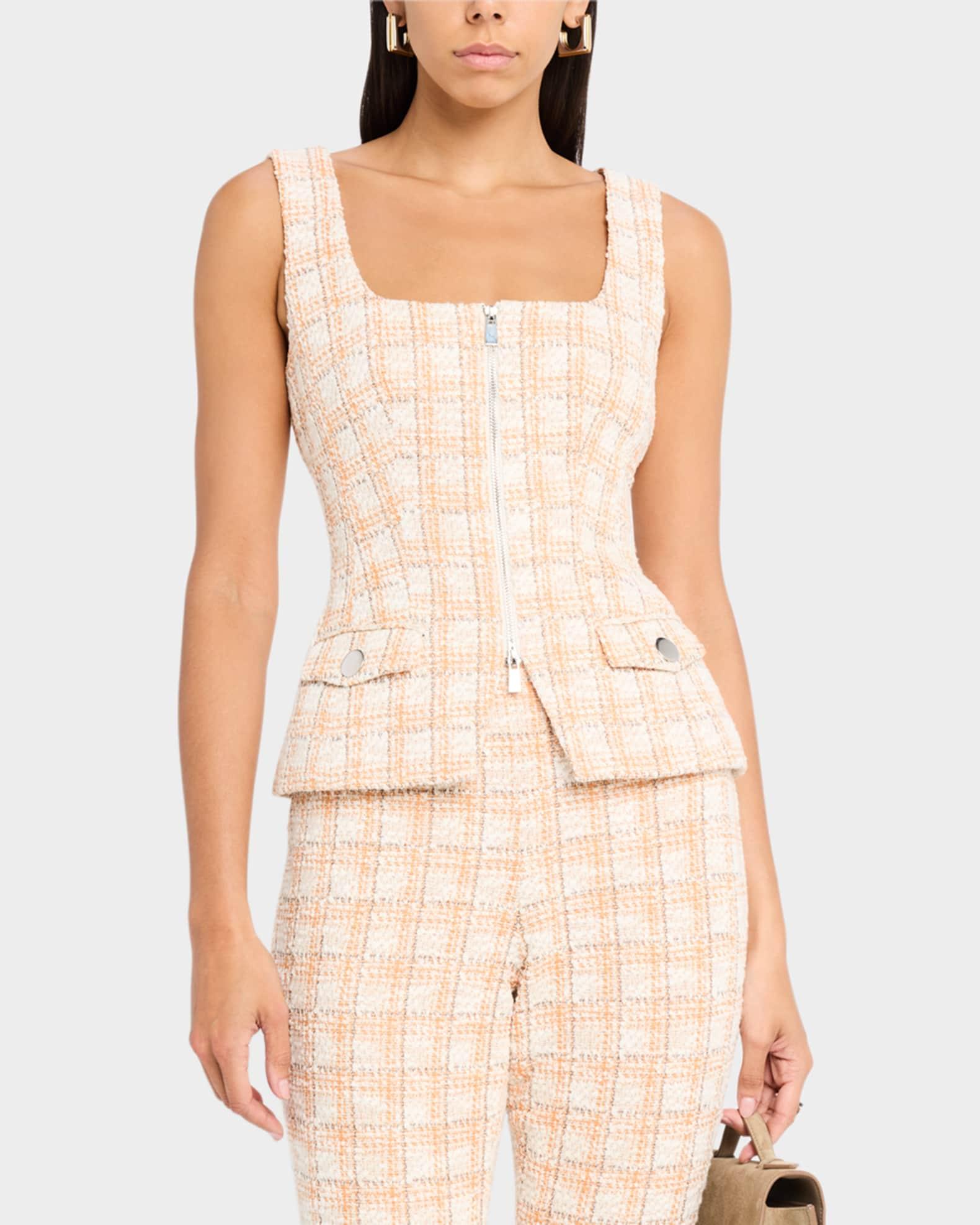 Toccin "Alicia" vest constructed of plaid tweed with silvertone hardware finishes Approx. 23"L from shoulder to hem Square neckline Sleeveless Flap pockets Hip length Tailored fit Two-way front zipper Polyester/cotton/acetate Lining: Polyester Imported