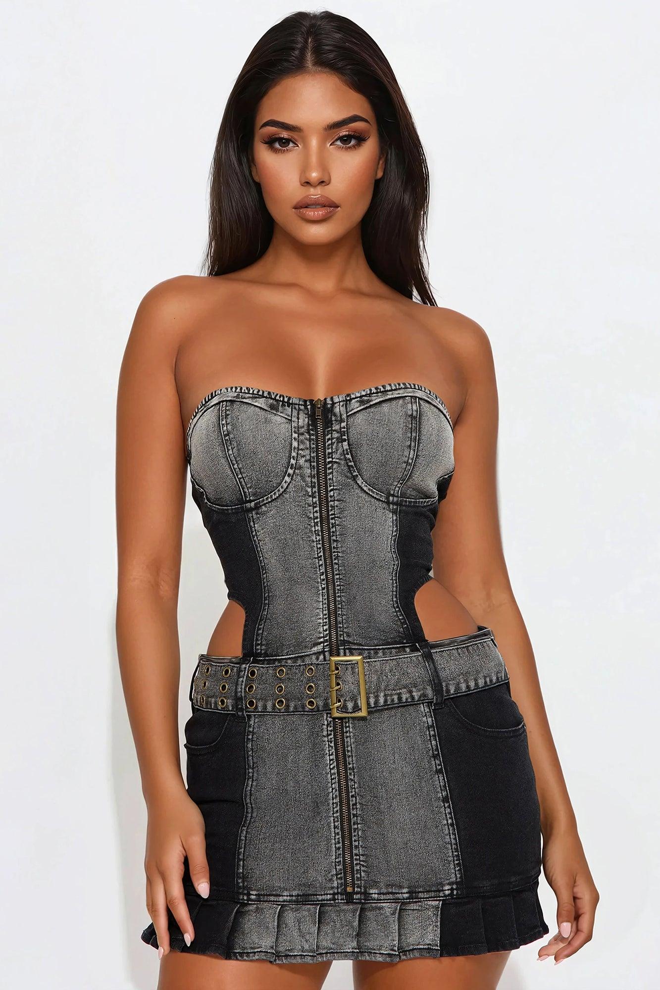 Alila Belted Denim Micro Mini Dress - Black Wash