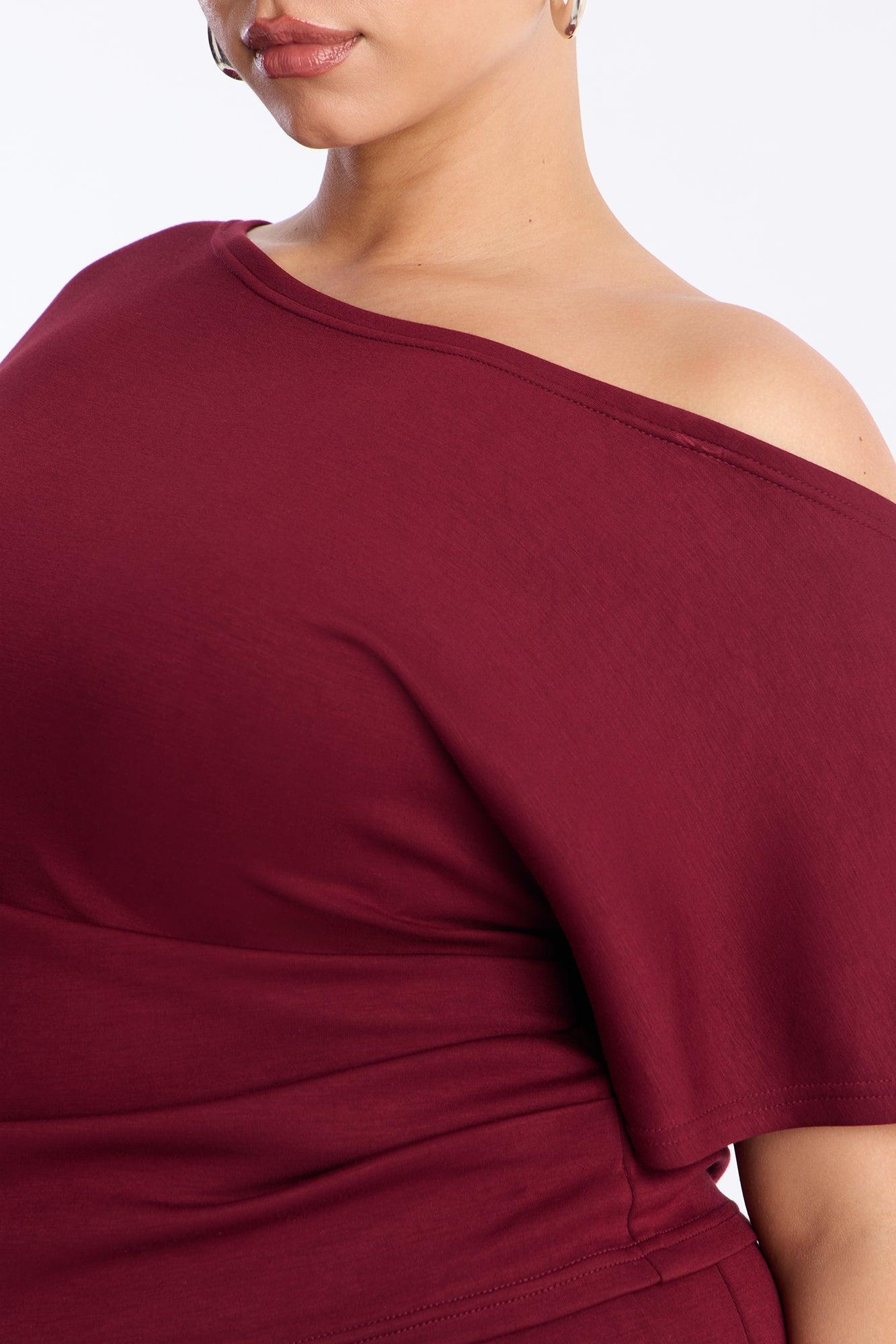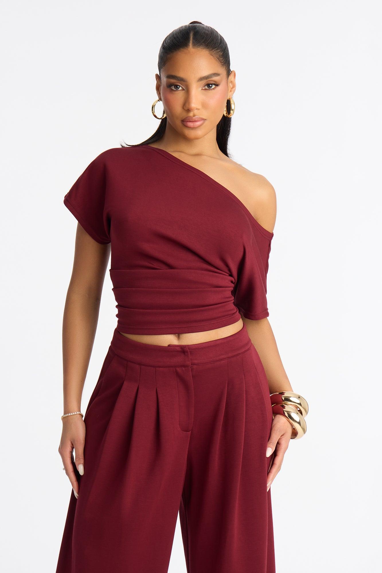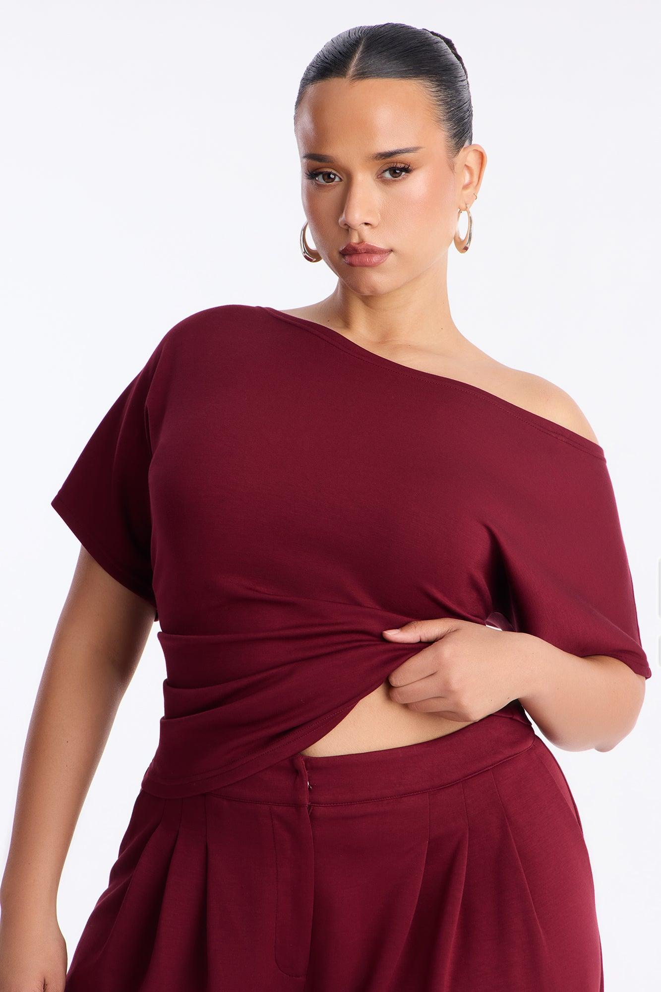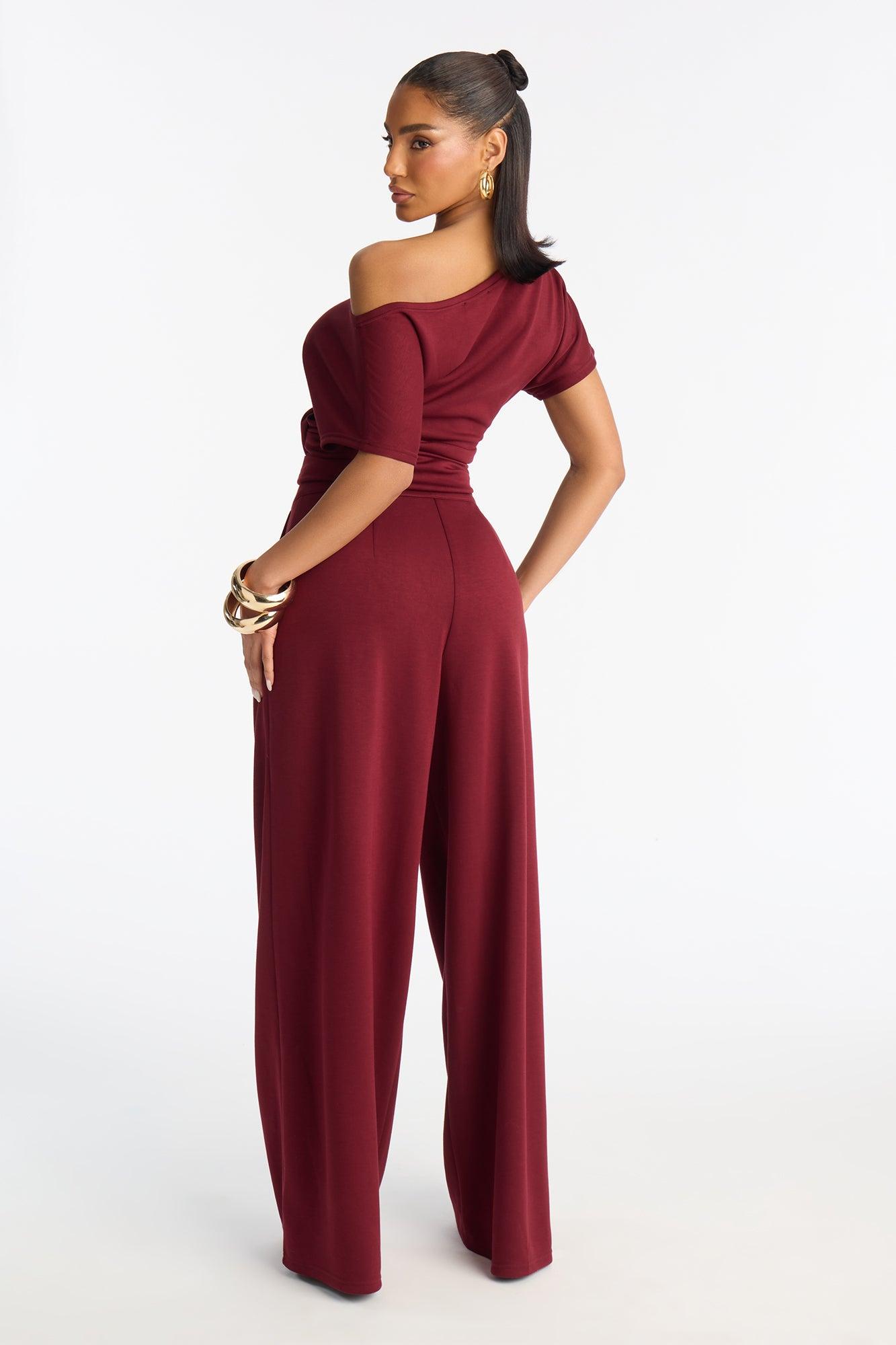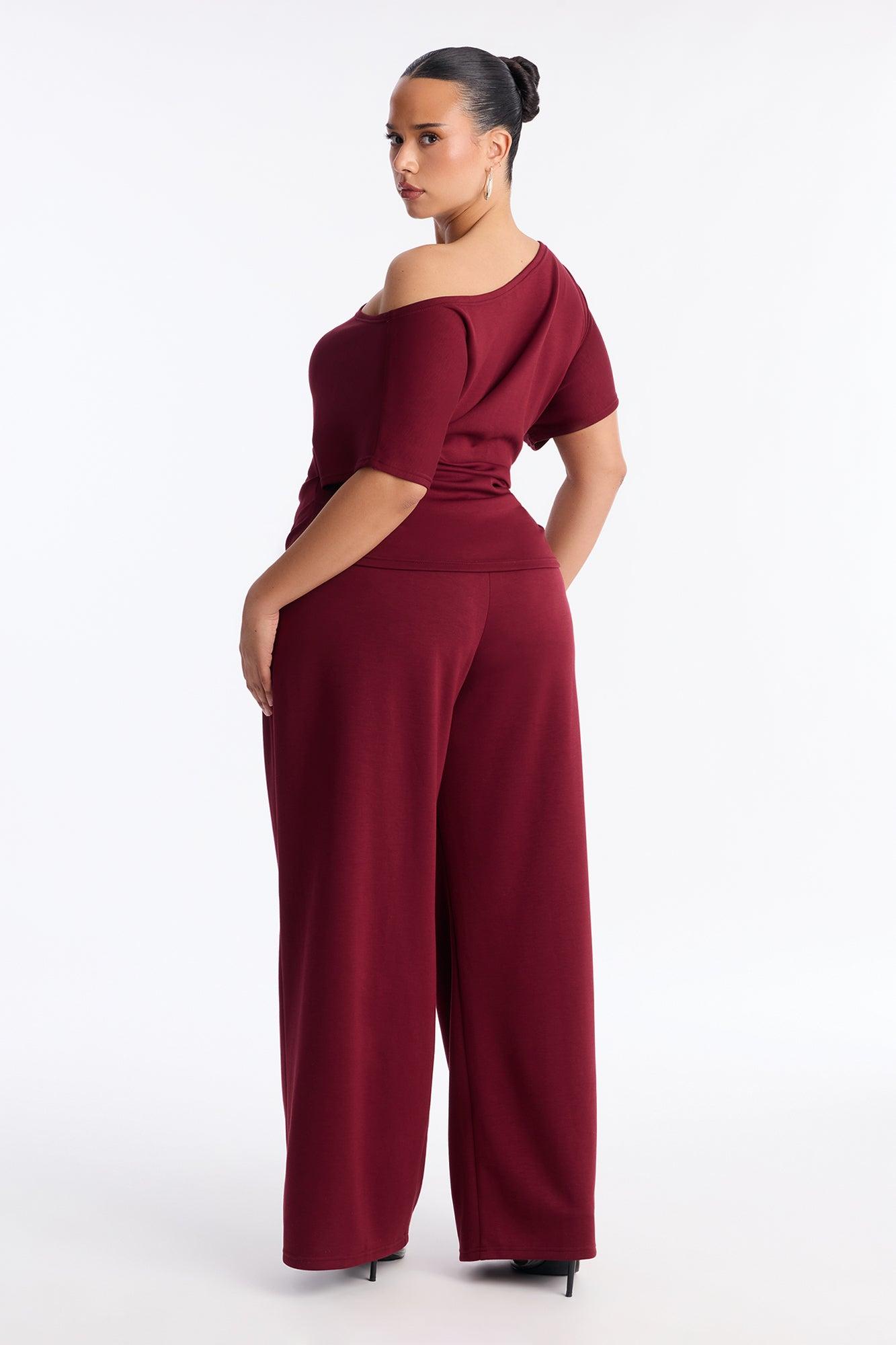 Available In Burgundy. 2 Piece Ensemble Off Shoulder Short Sleeve Top And Wide Leg Pant Set Stretch Front Button Closure With Fly Zipper On Pant Flat Front Elastic Back Waistband Pockets Self: 48% Polyester 45% Rayon 7% Spandex Imported California Proposition 65WARNING: Cancer and Reproductive Harm - www.P65Warnings.ca.gov.