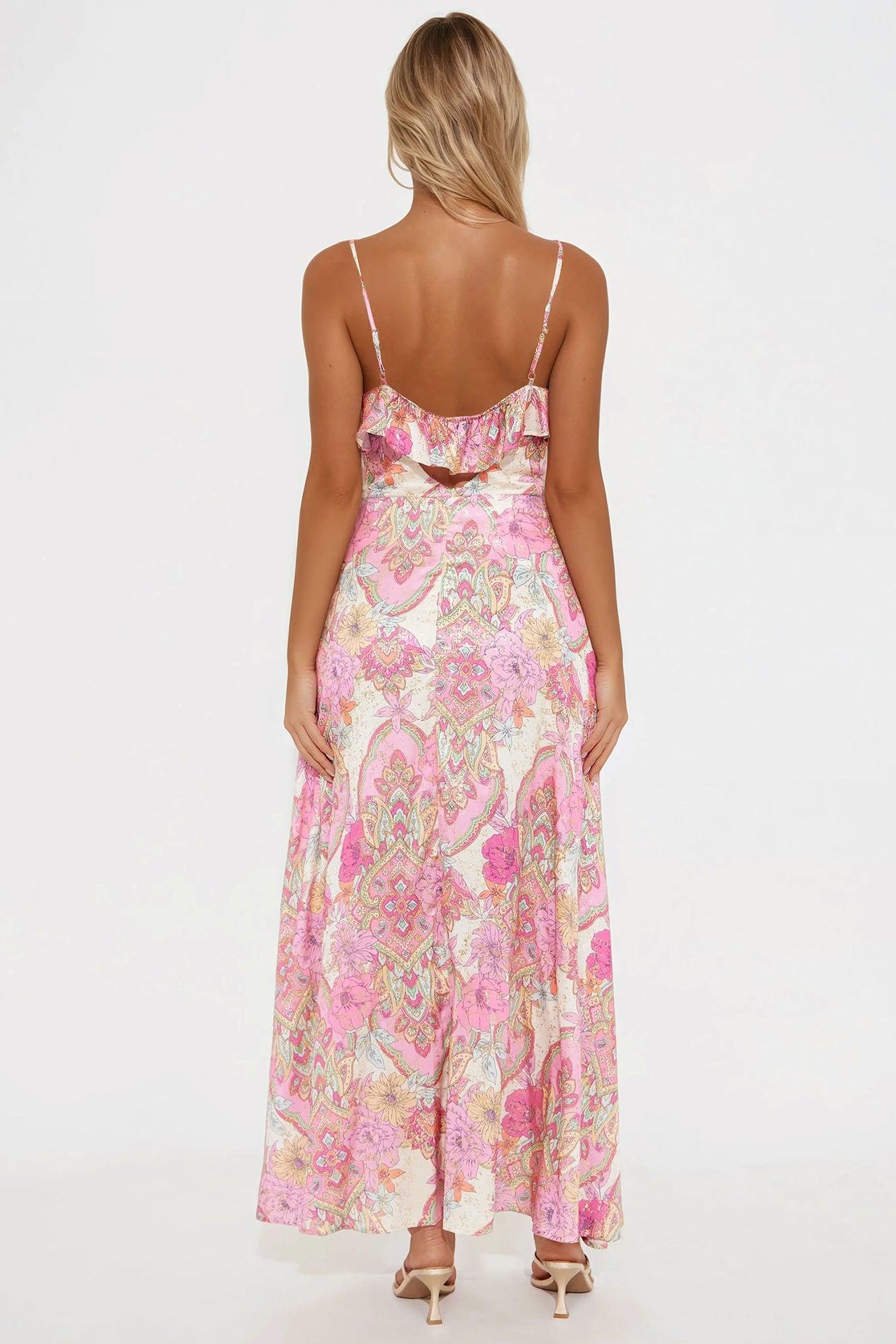Available In Pink/combo. Maxi Dress V-Neckline Adjustable Spaghetti Straps Ruffle Detail Button Up Detail Hidden Back Zipper Lined Stretch Self: 100% Polyester Lining: 100% Rayon Imported California Proposition 65WARNING: Cancer and Reproductive Harm - www.P65Warnings.ca.gov.