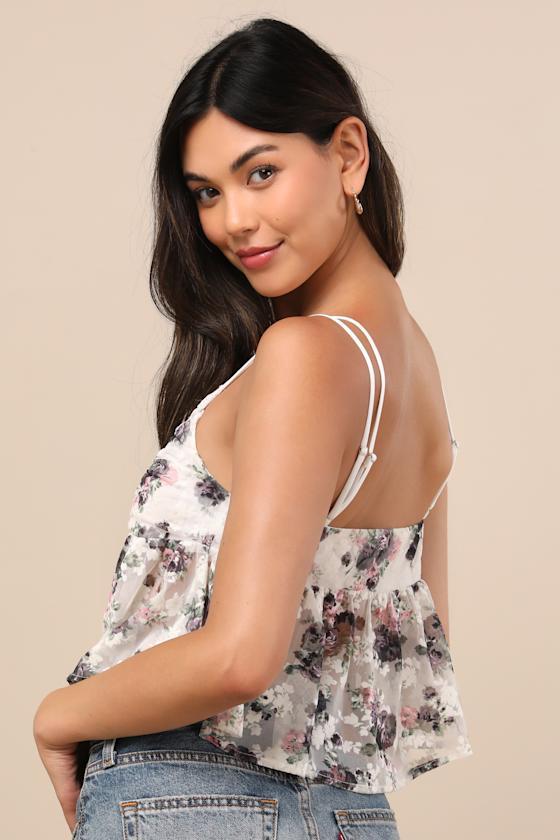 Adorned with a rose floral print and a textured floral motif, this breezy cami top will effortlessly catch your crush's eye. Dual adjustable straps support a lace-trimmed V-neckline and ruched, triangle-style cups, all atop a sheer floaty hem that creates the cutest babydoll silhouette.