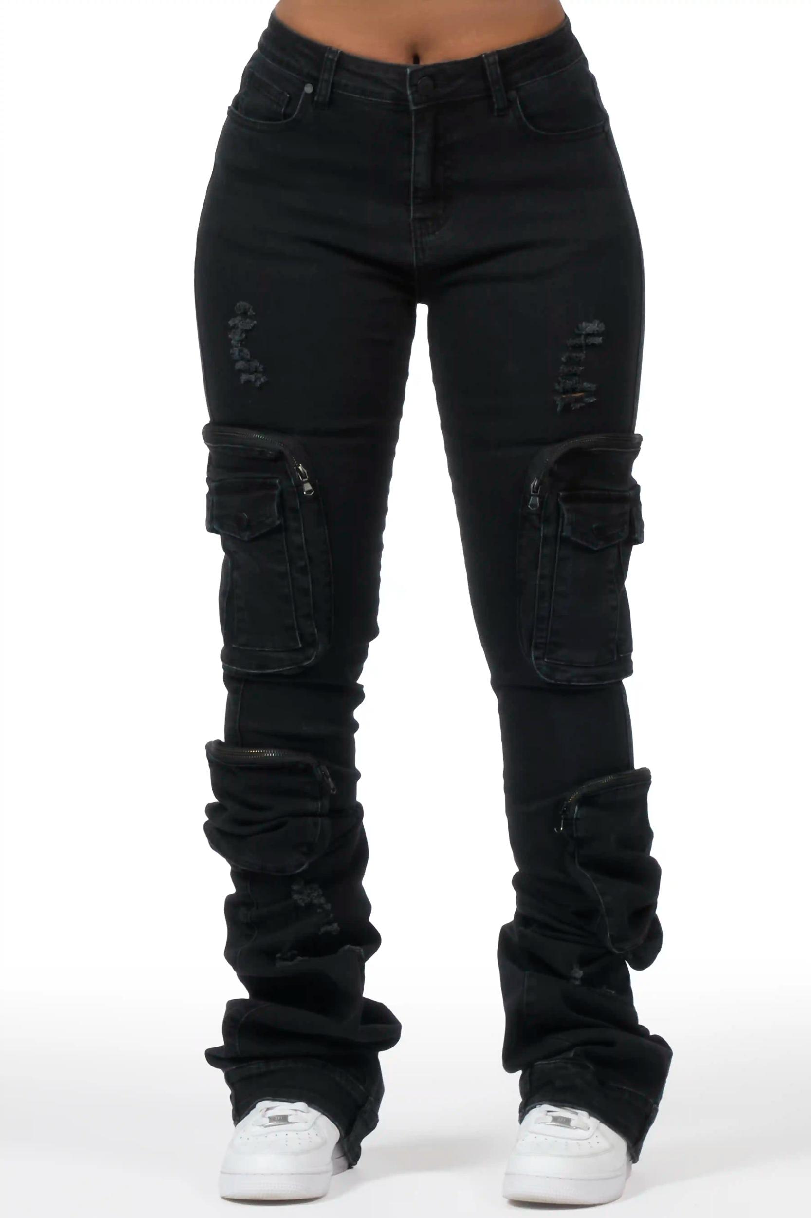 A trendy pair of super stack cargo jeans for women in black. Designed with premium stretch fabric and extra long legs for the perfect pair of streetwear jeans. Zip fly with button closure 7-pocket build High-waisted silhouette Fitted through the hip Flare leg openings Stretch waistband Super stacked construction 46" inseam