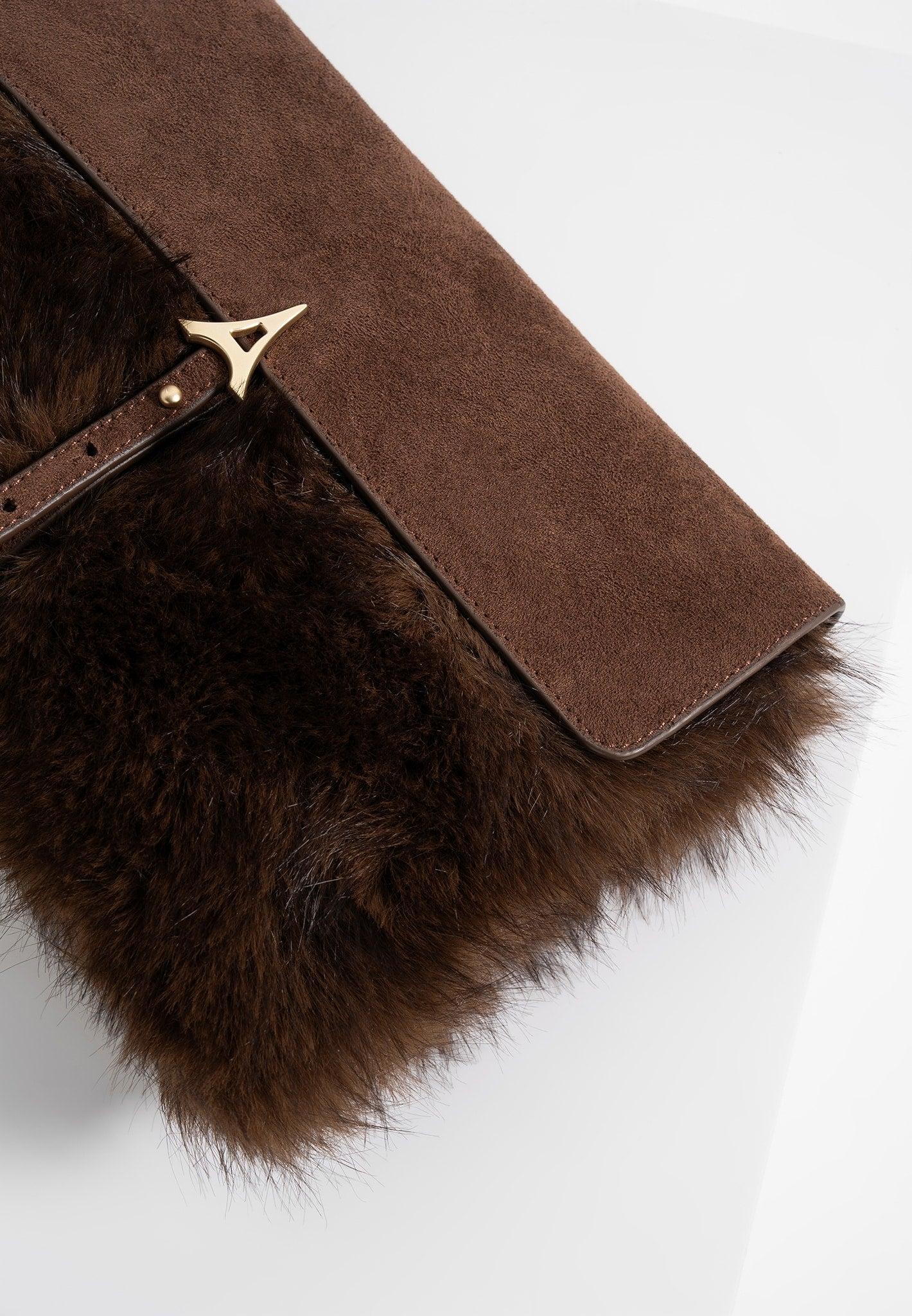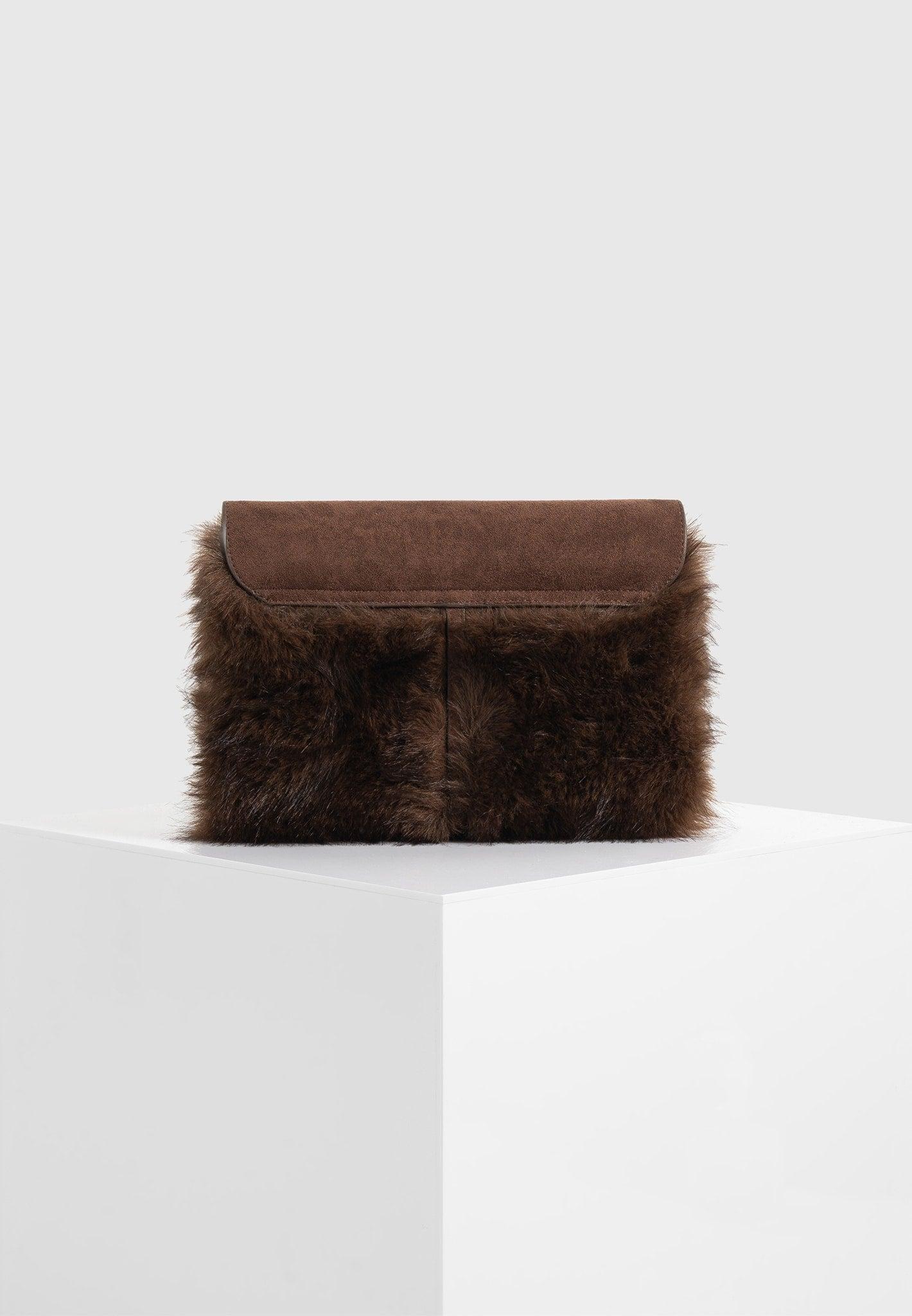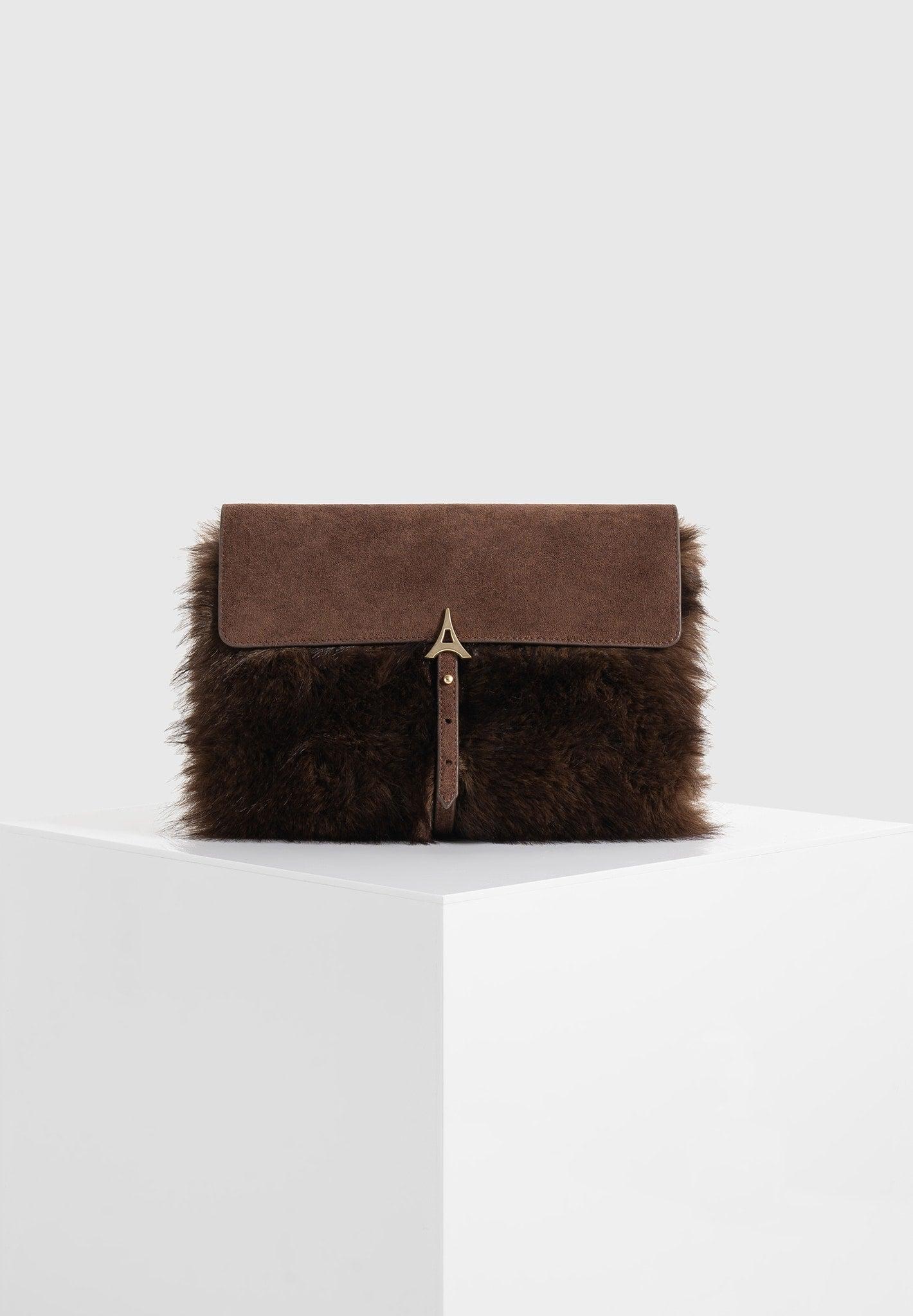 A refined statement piece, this clutch is crafted from two-tone faux fur for a soft, textured finish. The contrast vegan suede flap and belted closure add depth and visual interest, while the gold Eiffel pouch detail provides a signature accent. Designed with a compact silhouette, it secures with a discreet magnetic closure, blending elegance with everyday practicality. Crafted from two-tone faux fur for a soft, textured finish Contrast vegan suede flap and belted closure for visual interest Clutch silhouette for an elegant, compact design Magnetic closure for secure and effortless access Gold Eiffel pouch detail for a signature statement accent