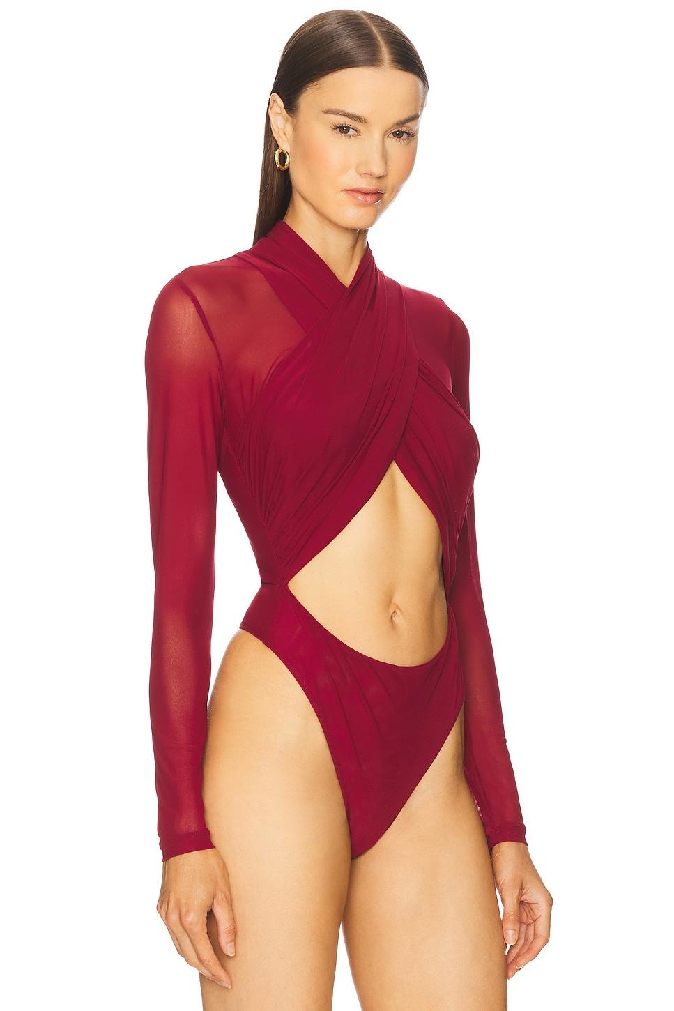92% nylon, 8% elastane. Hand wash cold. Thong back with gusset snap closureBack zip closure. Front cut-out accent. Midweight mesh fabric. Garment is made with a semi-sheer fabric, undergarments can show through. Made in China. Revolve Style No. BARD-WS452. Manufacturer Style No. 60050TB.