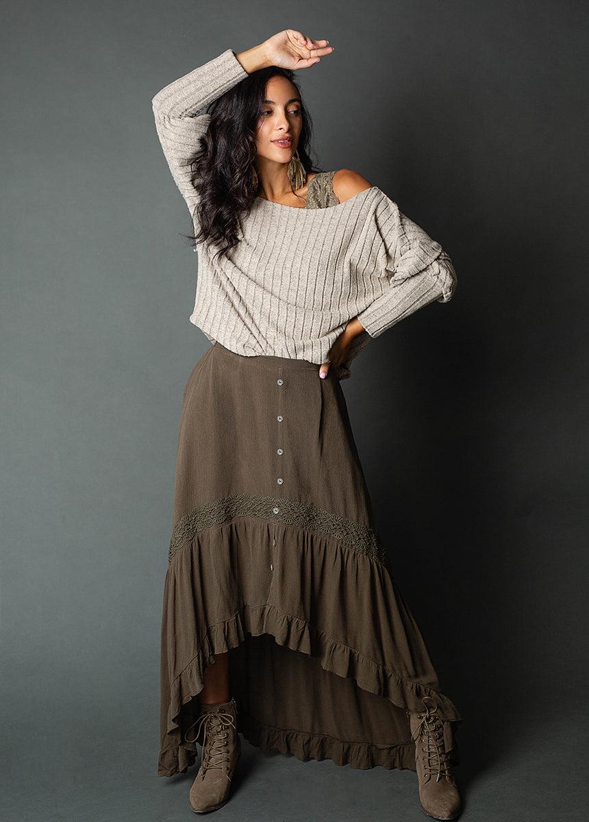 Introducing the Alizah Skirt—your go-to for effortless layering and versatile styling! This essential piece showcases beautiful boho detailing and an elastic waist for unparalleled comfort. Perfect for both casual and dressed-up looks, the Alizah Skirt seamlessly enhances any outfit, making it a must-have staple in your wardrobe. High low hem Midi to maxi Elastic at back waist Shell buttons on front Lace trim Ruffle hem Short length lining Self: 100% Rayon // Lining: 100% Polyester Hand wash only, line dry Model is 5'5 wearing an XS
