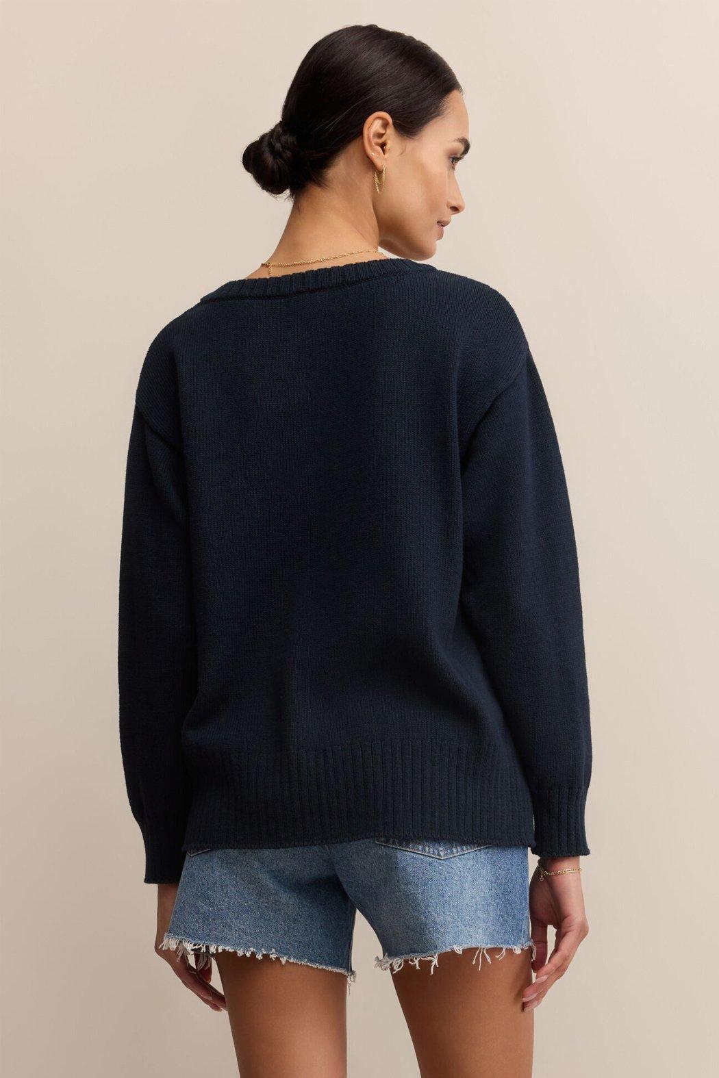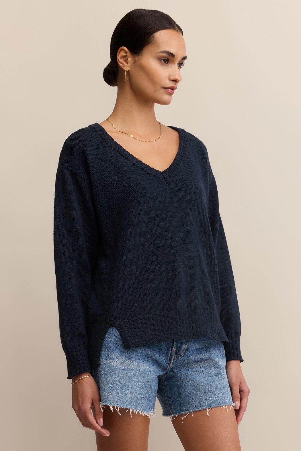 Spun from soft cotton yarns, this relaxed v-neck sweater features drop shoulders, forward side seams, and a stepped hem for a laid-back silhouette. In a classic deep navy and finished with rib trim and subtle texture, it’s that throw-on-and-go piece your closet needs.