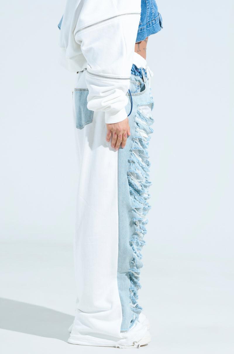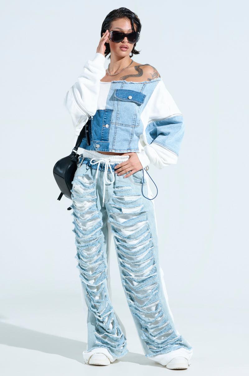 Strut the block in The AKIRA Label All Around The City Pant. These model-off-duty bottoms are crafted from a stretchy cotton knit base and feature a high rise, shirred elasticized waistband with drawstring closures, a light wash, ultra-distressed denim overlay on the front with ruched waistband detailing that boasts functional belt loops and bungee cord closures, and a classic five-pocket design with contrast denim rear pockets. Complete with elastic pant cuffs, a relaxed silhouette, and an easy, pull-on fit. Pair with the matching AKIRA Label All Around The City Sweatshirt and stiletto booties for a streetwear-inspired look. - Main: 65% Cotton 35% Polyester, Trim: 75% Cotton 23% Polyester 2% Spandex- Hand Wash Cold- Stretchy- Imported (all measurements approximate from size small)- 12” Rise- 31” Inseam- Model is 5’7” and is wearing size smallProduct ID: 439670 (all measurements approximate from size 1X)- 13” Rise- 32” InseamProduct ID: 439674