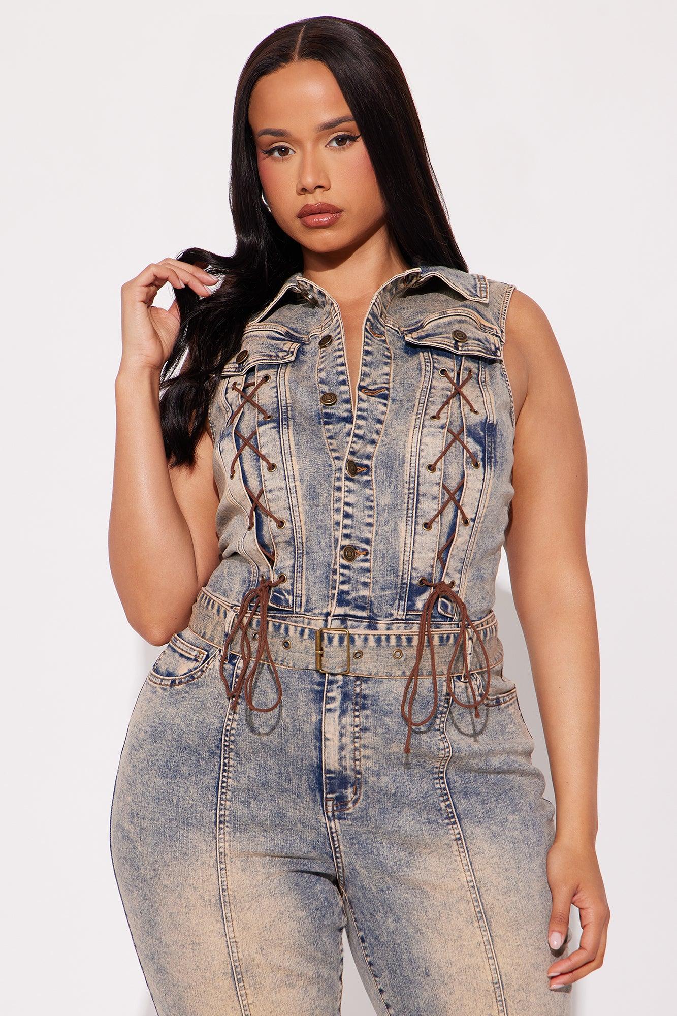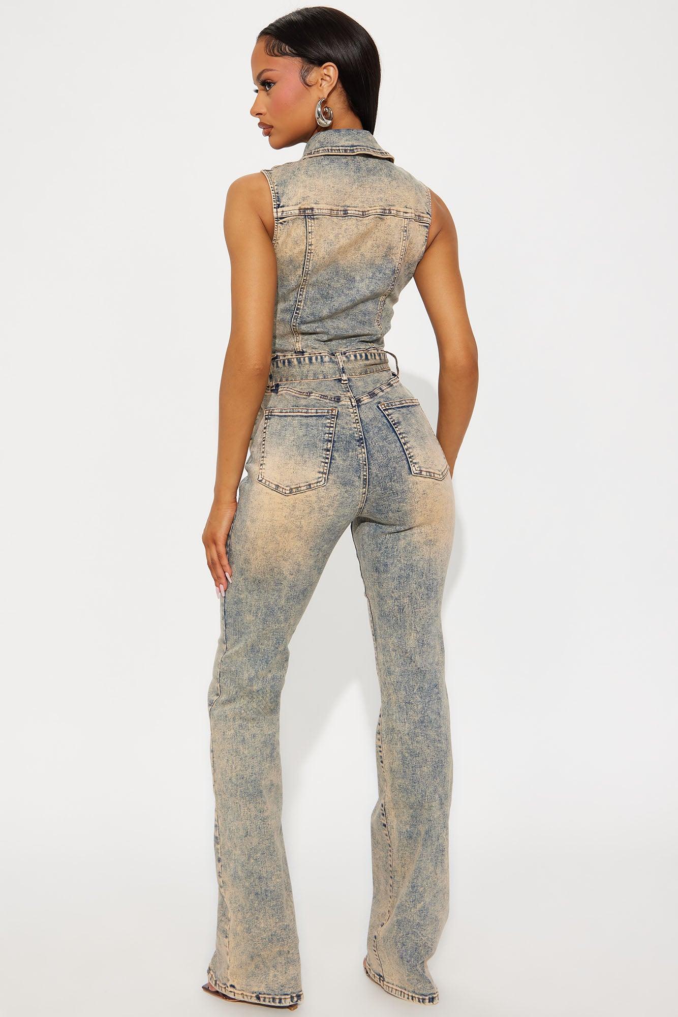 Available In Medium Wash. Jumpsuit Button Up Front Closure With Fly Zip Adjustable Belt Pocket Detail Flare Leg Stretch Inseam = 34" Self: 74% Cotton 23% Polyester 2% Viscose 1% Spandex Imported California Proposition 65WARNING: Cancer and Reproductive Harm - www.P65Warnings.ca.gov.