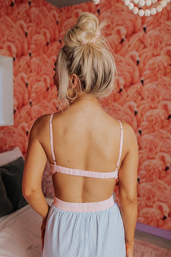 – Wake up in style with this luxe top – Lightweight, soft, and unlined cotton material in pink and white striped pattern – Sweetheart neckline with a front knot detail – Gather elastic back – Adjustable spaghetti straps – Flattering triangle silhouette that ends in a straight hemline