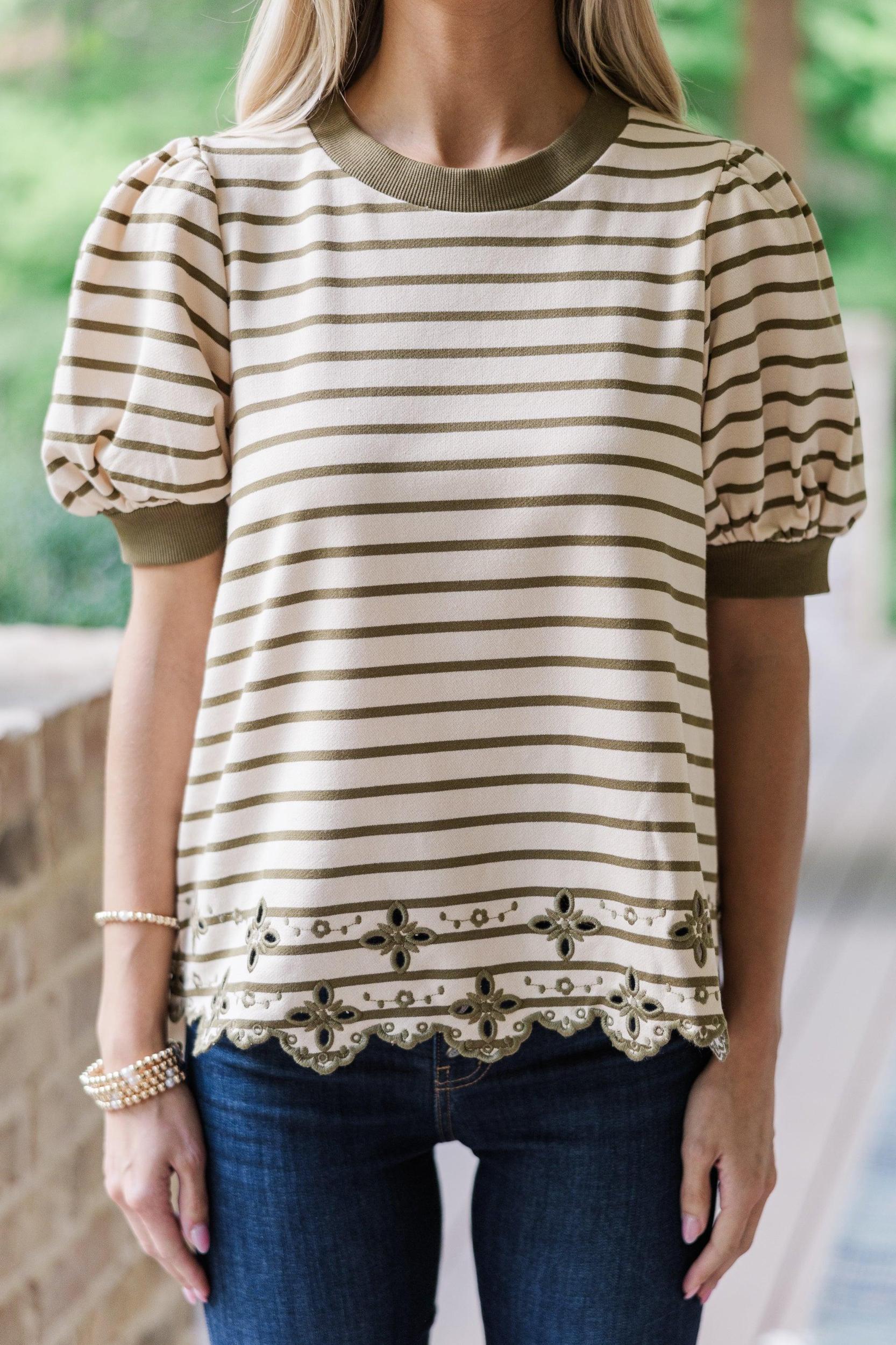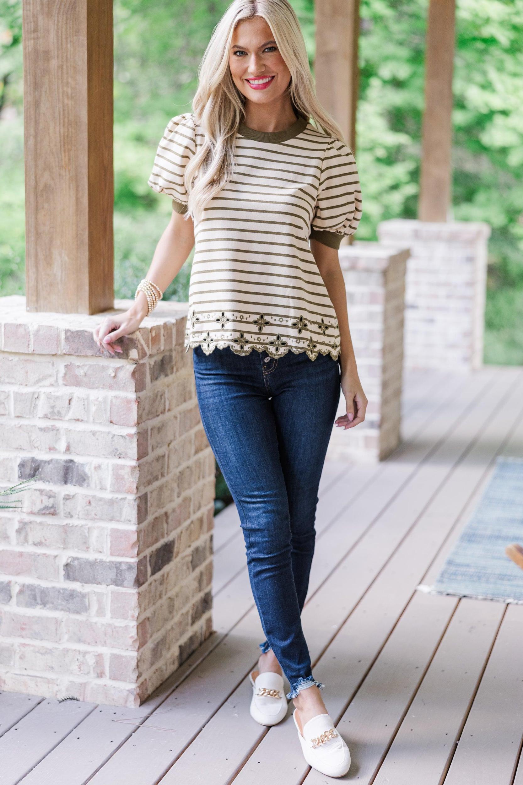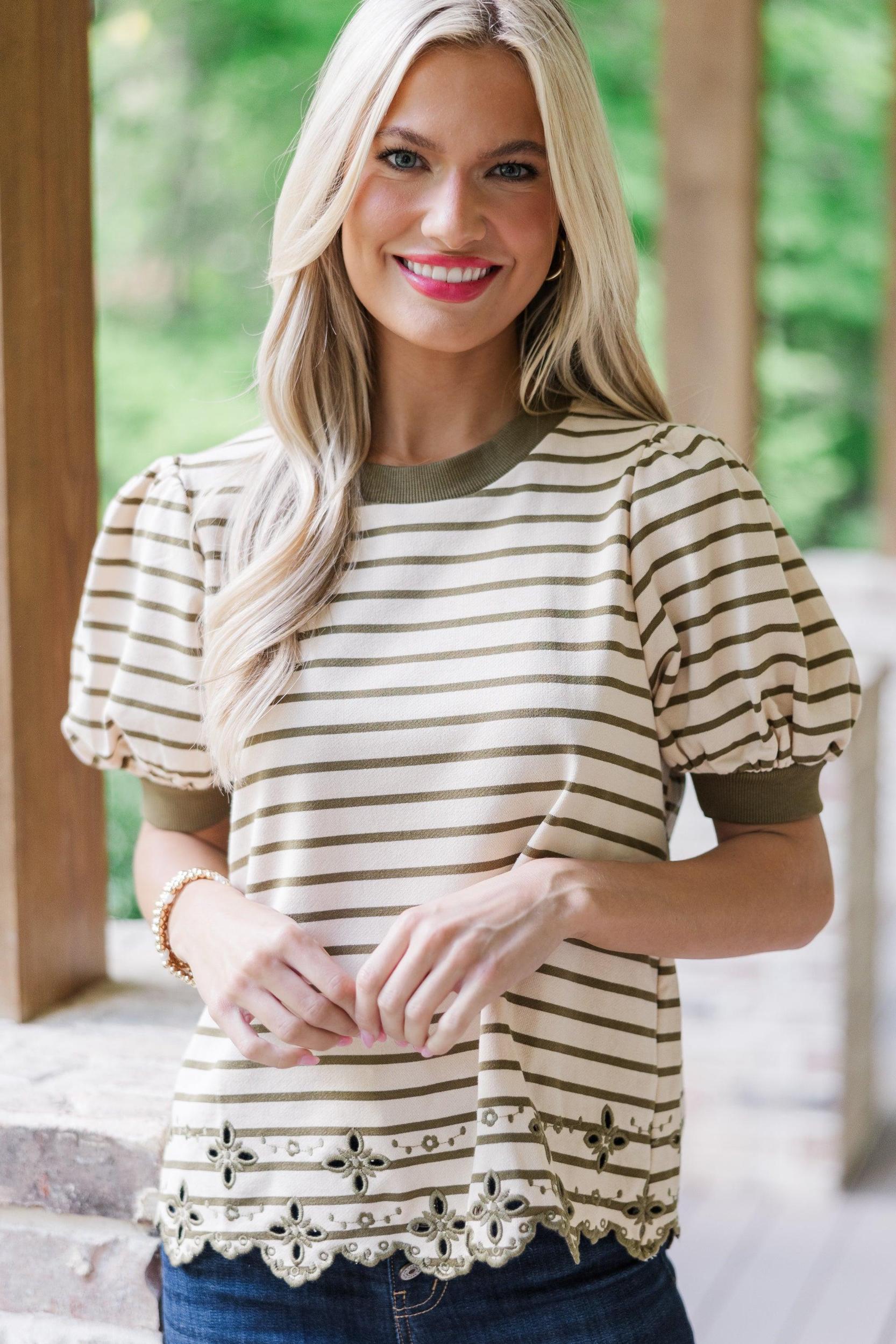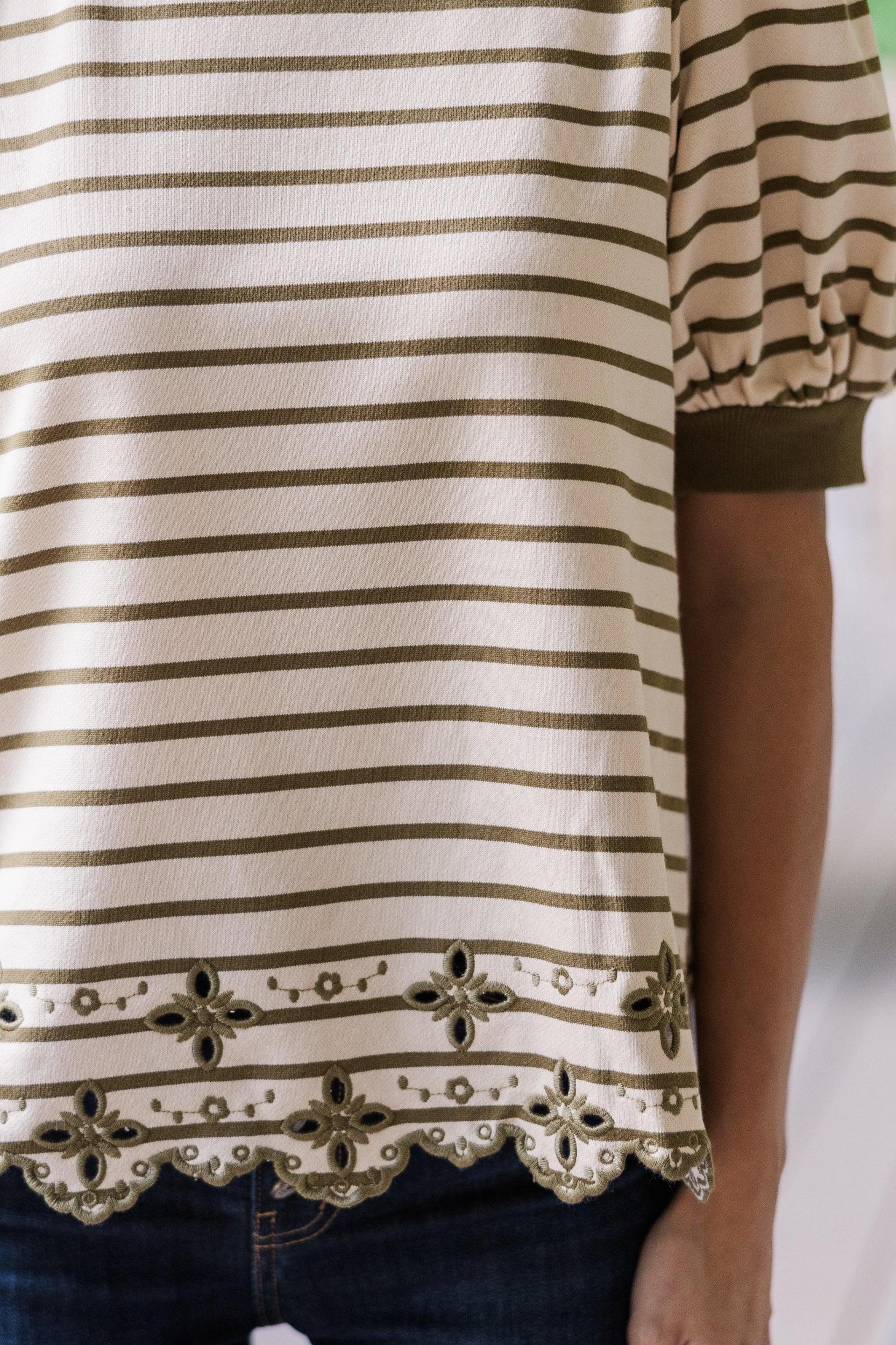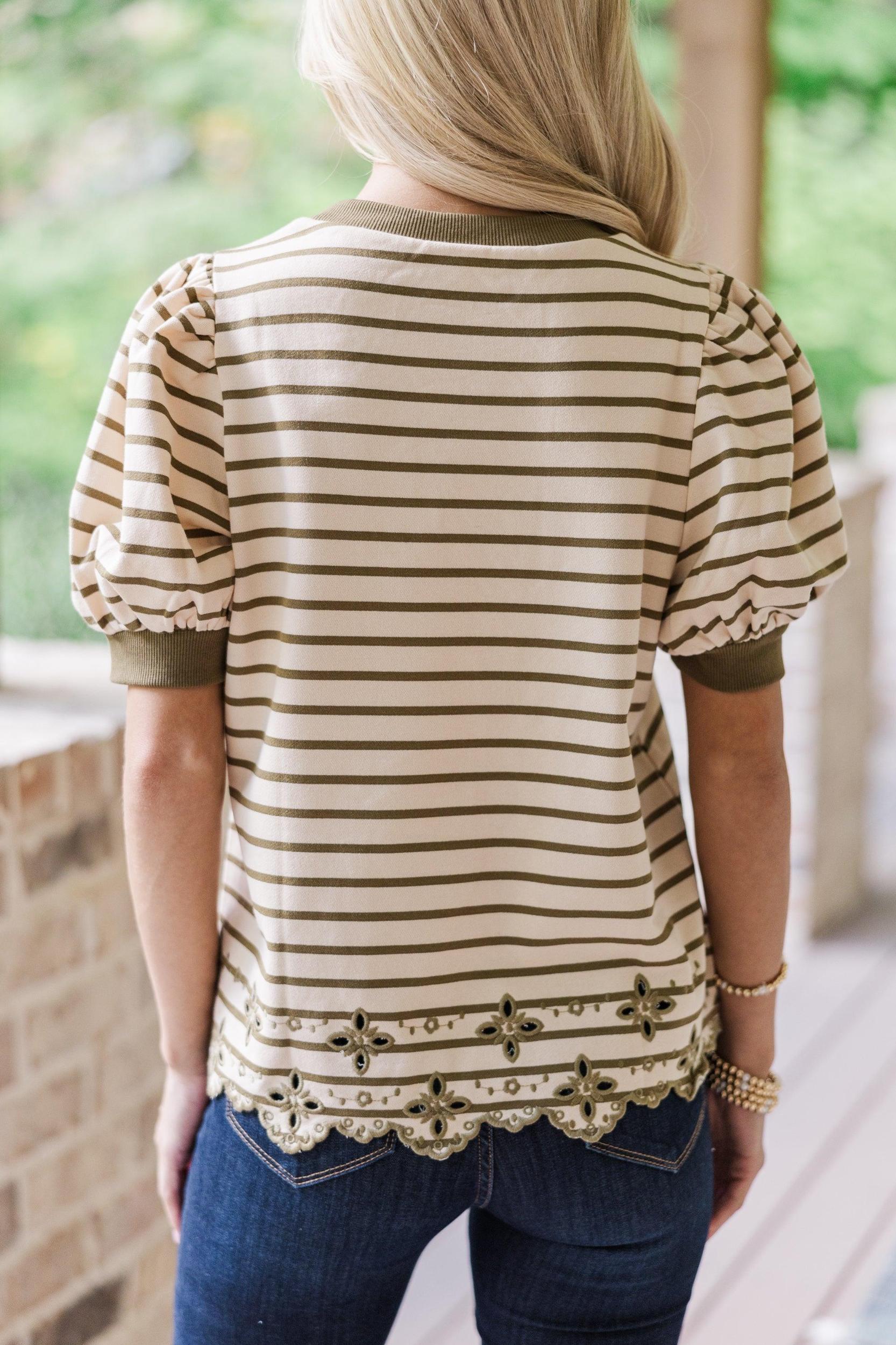 This striped blouse is the perfect combination of cute and comfy, chic and casual! It's the best of both works! The striped print is so classic and we love the eyelet detailing along the hemline. Round neckline Short puff sleeves Striped print Eyelet detailing Fair stretch Baileigh is wearing the small.