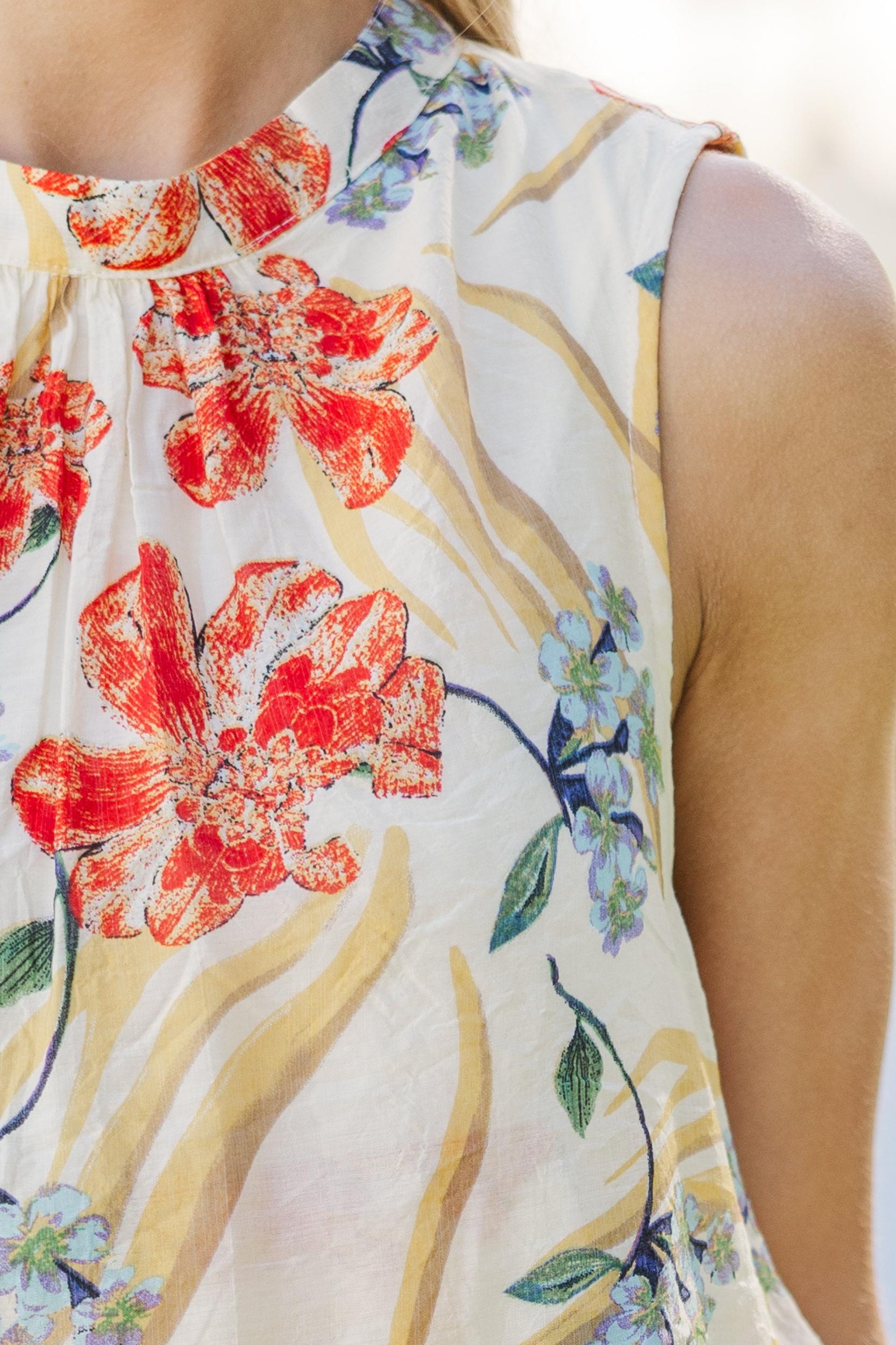 Twirl into summer in this dreamy ruffle-tiered dress! The red and blue floral print pops beautifully against the ivory backdrop, while the layered silhouette gives it the sweetest swing. It’s lightweight, breezy, and so ready for sunshine! Round neckline Tied back closure Sleeveless cut Flowy tiered cut Floral print Material has no amount of stretch Baileigh is wearing the small.