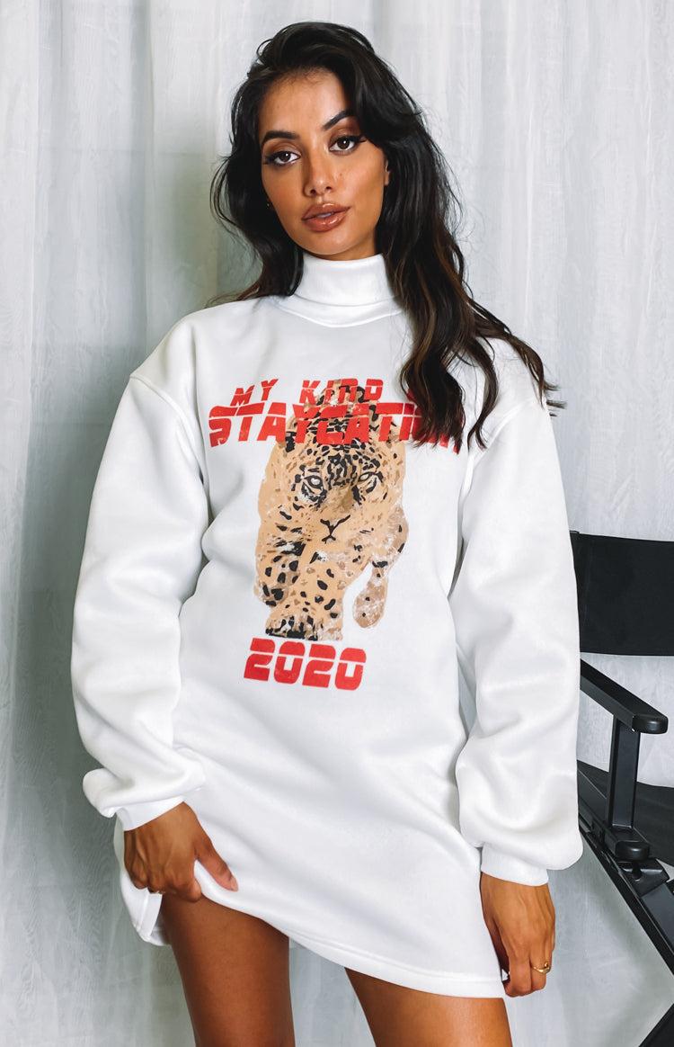 White Sweater DressThis oversized, sweater dress is our fave for a casual weekend in or out - wear it with some sneakers for laid-back, cool-girl vibesGraphic print on centre-frontLong sleevesLined high-neck that can be rolled down - ribbed knit fabricSuper soft material inside
