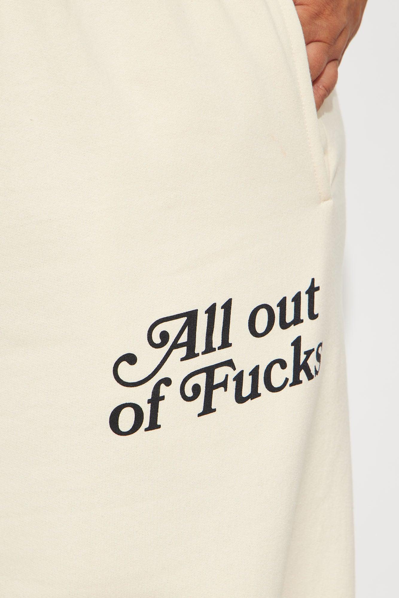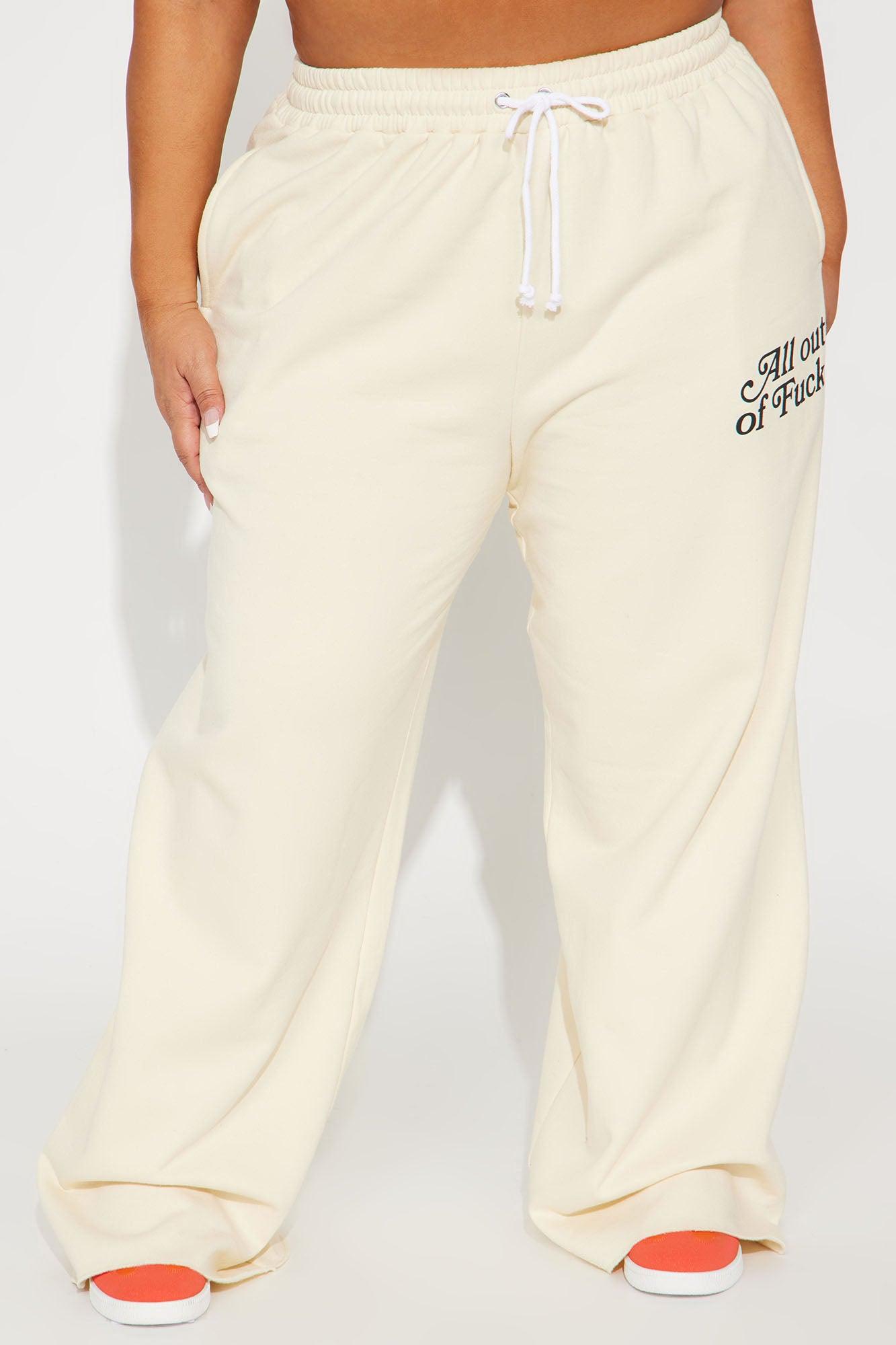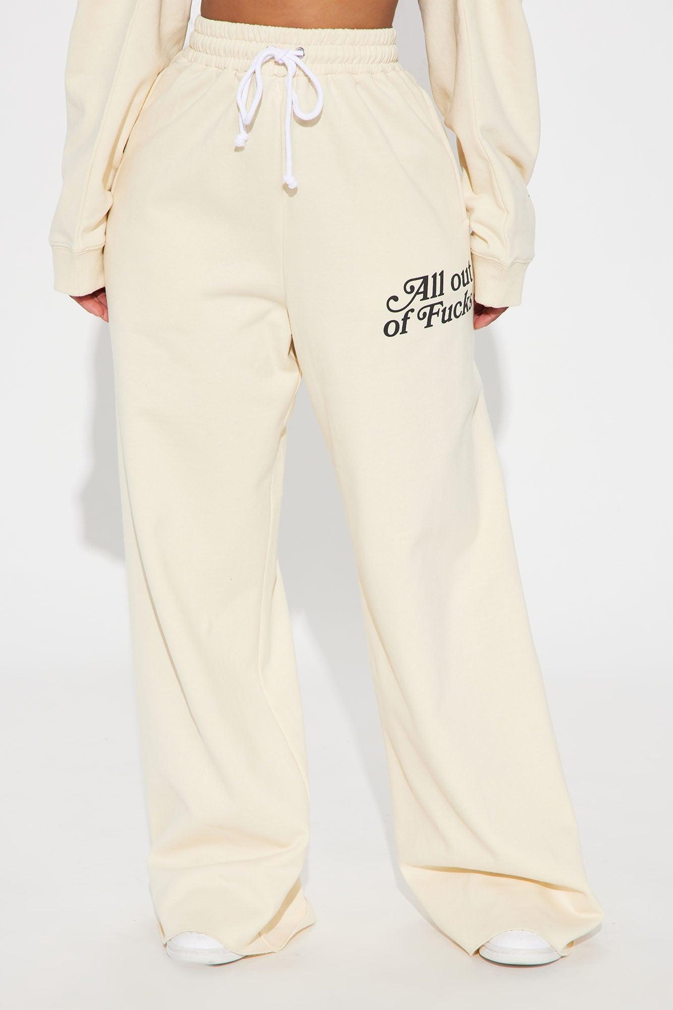 Available In Cream. "All Out Of Fucks" Verbiage Wide Leg Pull On Pant Drawstring Waist Paid Back To "All Out Of Fcks Sweatshirt" Disclaimer: Due To The Printing Process A Difference In Saturation May Occur. Each Garment Is Unique. 60% Cotton 40% Polyester Imported