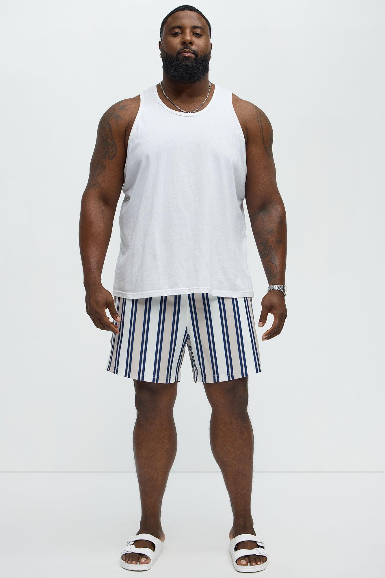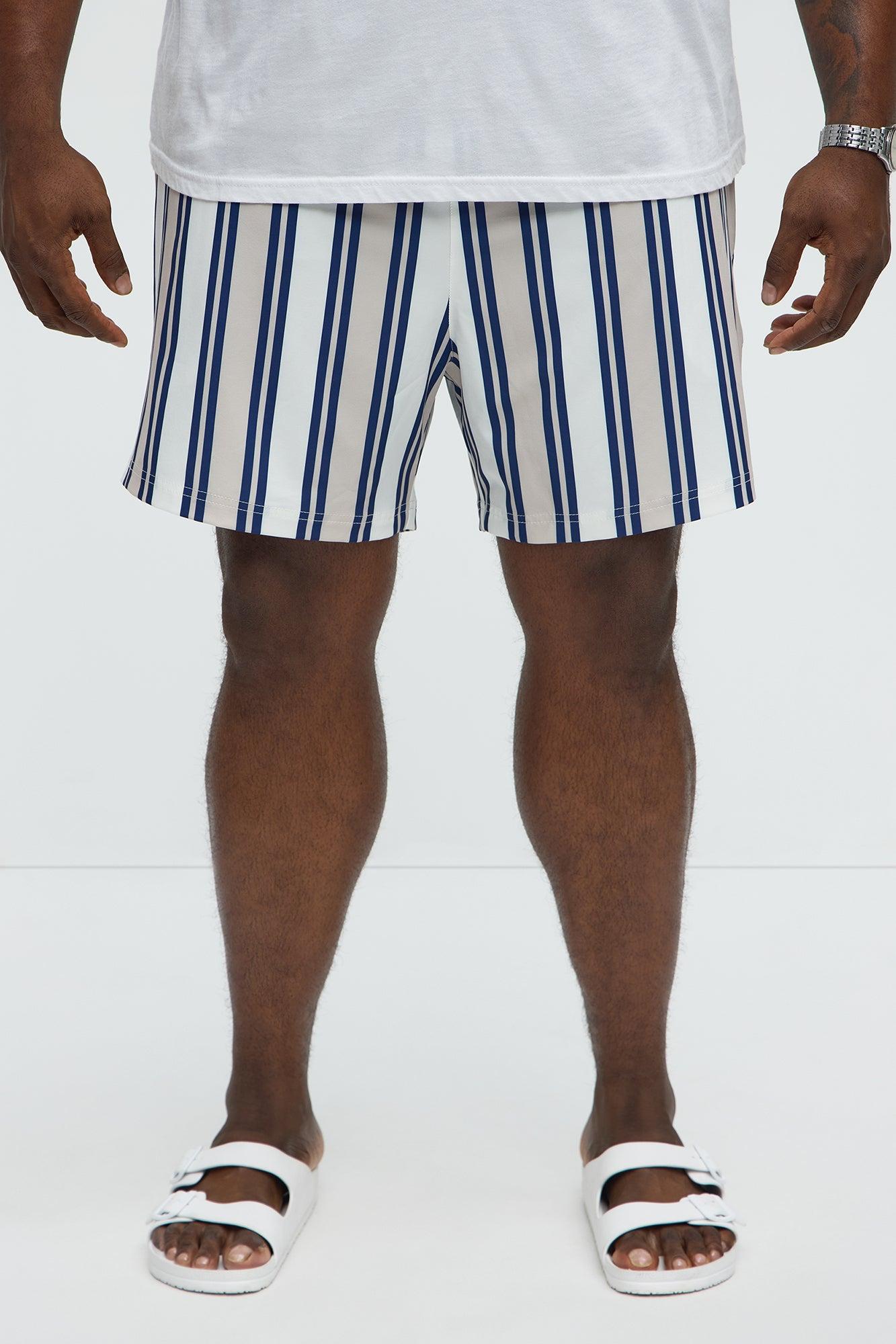 Available In Blue/combo. 6" Inseam Relaxed Fit Elastic Waist Drawstring Mesh Lined Striped Print Side Hand Pockets Final Sale Shell: 92% Polyester, 8% Spandex Lining: 95% Polyester, 5% spandex Imported
