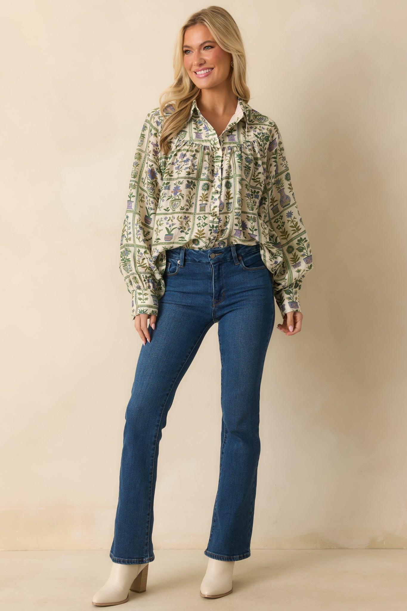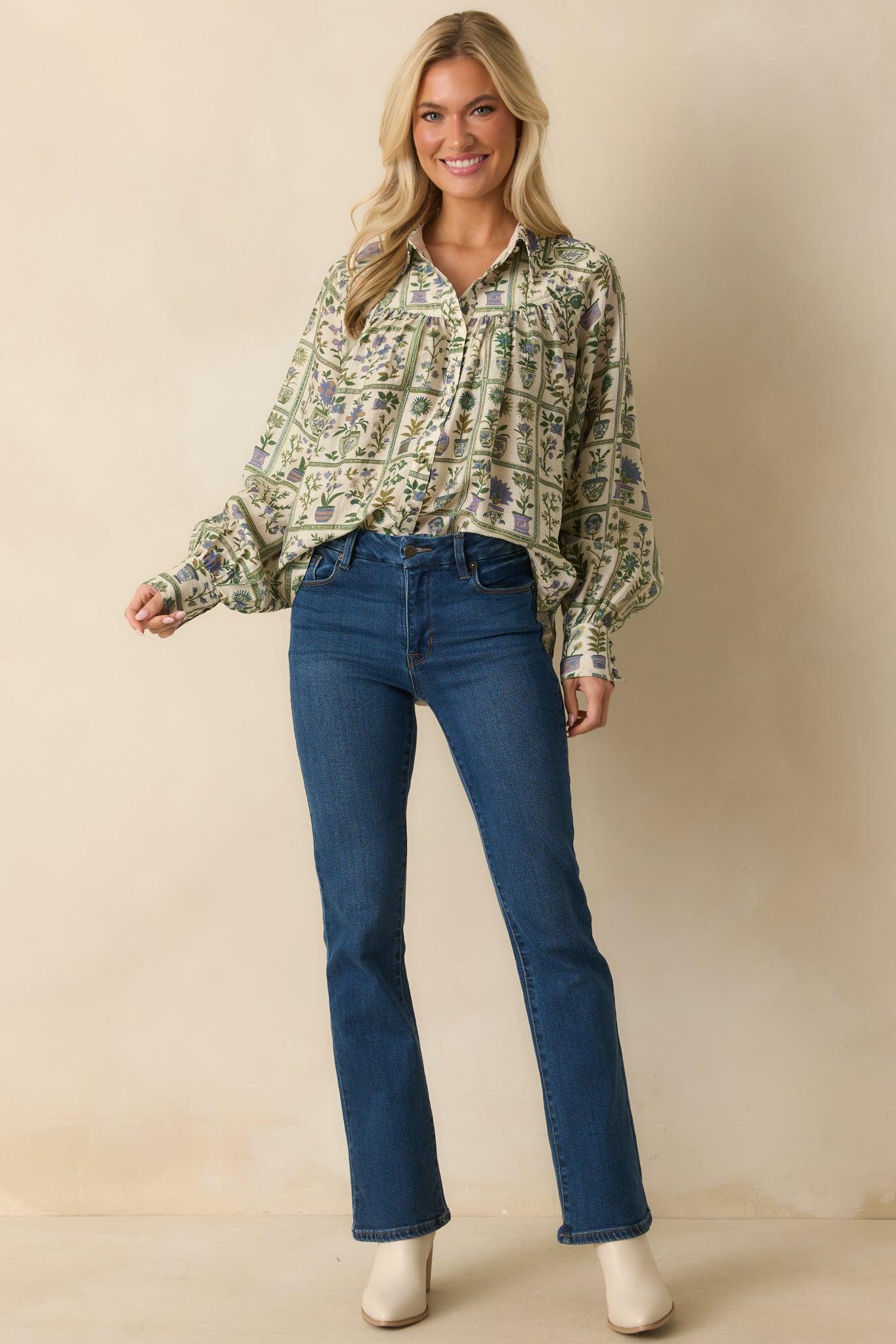 The All Set Then Green Multi Floral Print Linen Blend Button Up Blouse makes getting ready feel simple, a breezy style that’s polished enough for any plan. This blouse features an allover green multicolor floral print, a collared neckline, functional button front, gathered yoke detail, long sleeves with button cuffs, and a relaxed fit. 73% Polyester, 11% Linen, & 16% Nylon Unlined Hand Wash Cold Manufactured in China Designed in the USA Model is 5'8" and wearing size small