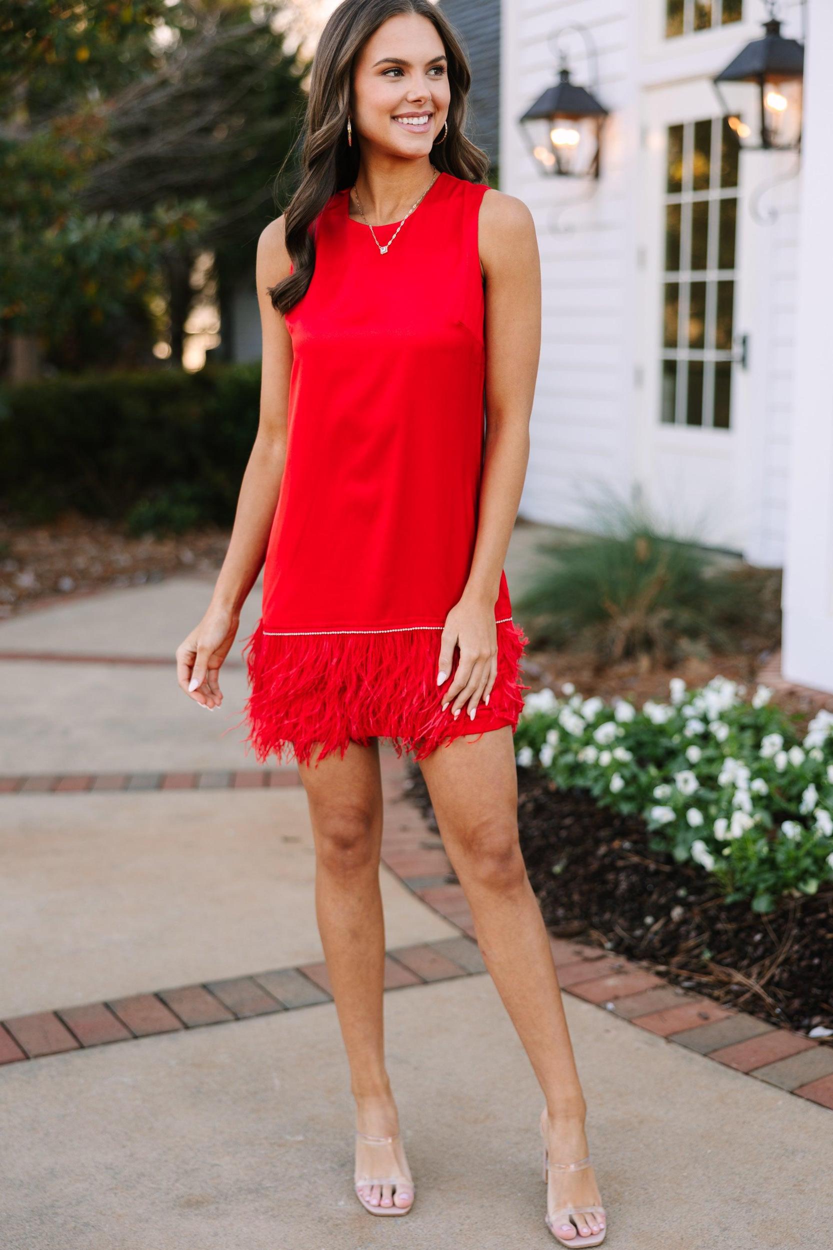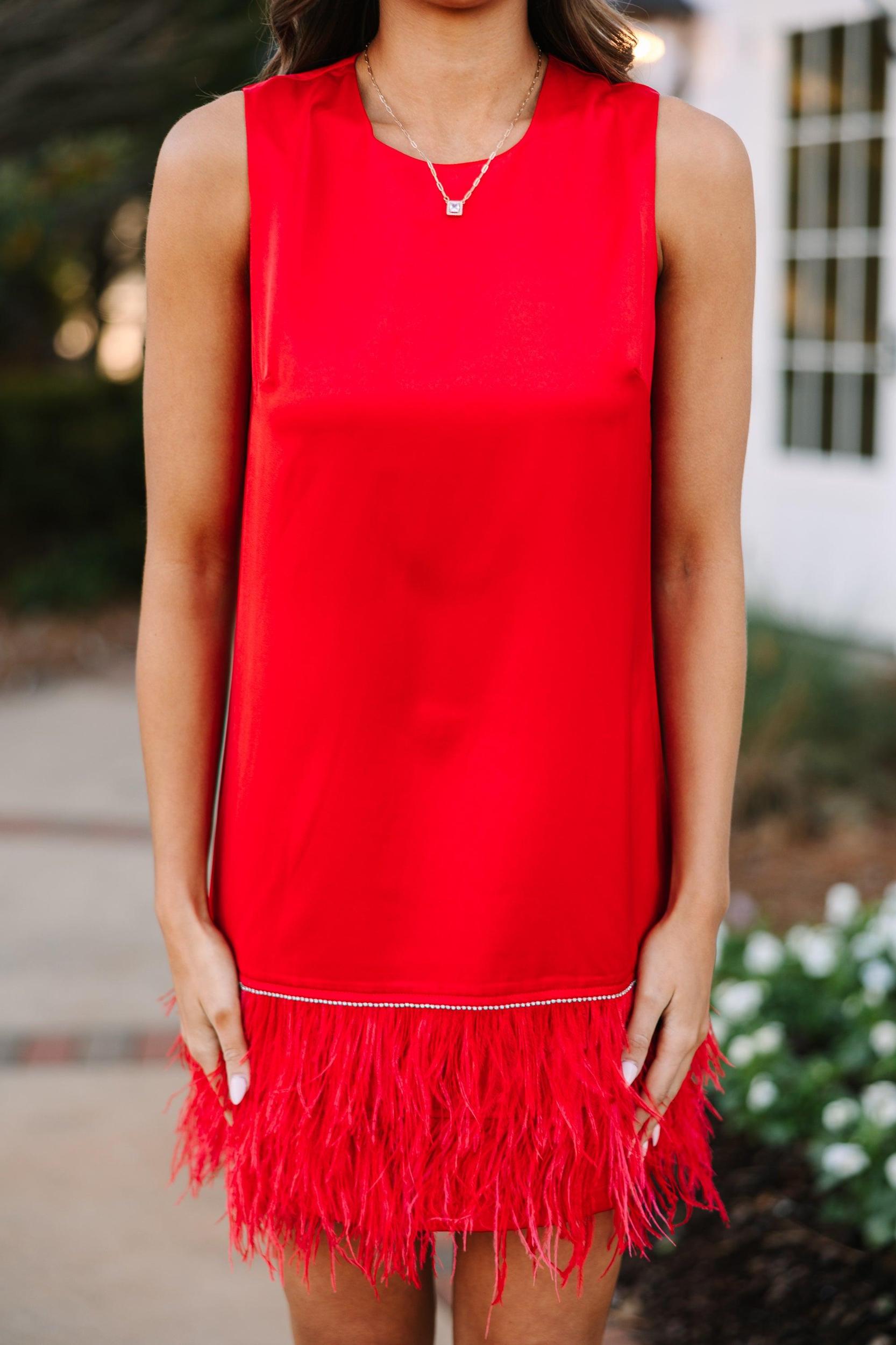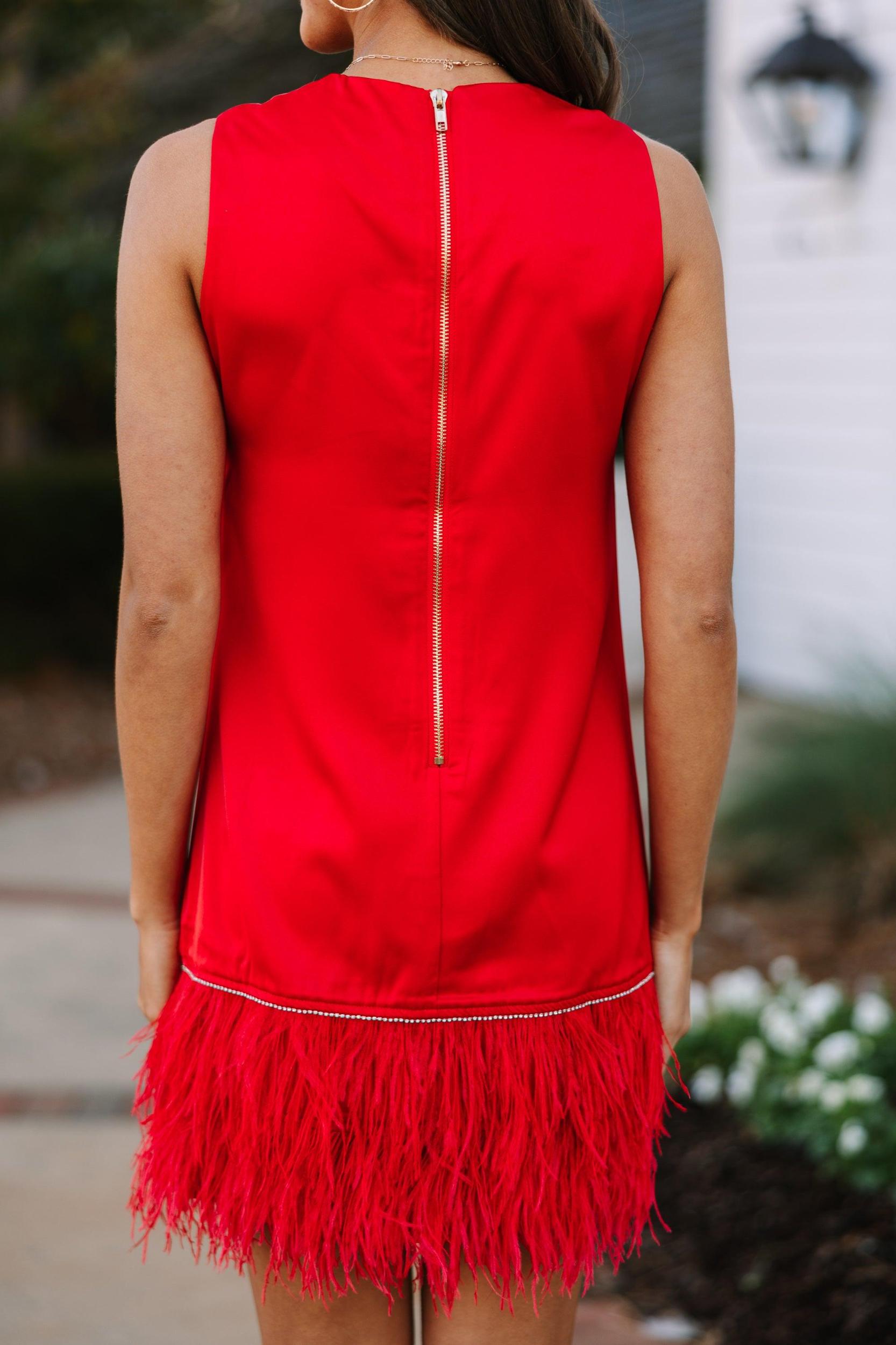 This dress brings all the drama! That feathered hemline is so sassy and fun! We especially love that strip of rhinestones just above the feathers! This shift dress is going to look amazing for any date night, holiday party, or fancy wedding! This dress features a round neckline, a shift fit, a zip back closure, a rhinestone trim detail, and a feathered hem. Material has no amount of stretch.Sydney is wearing the small.