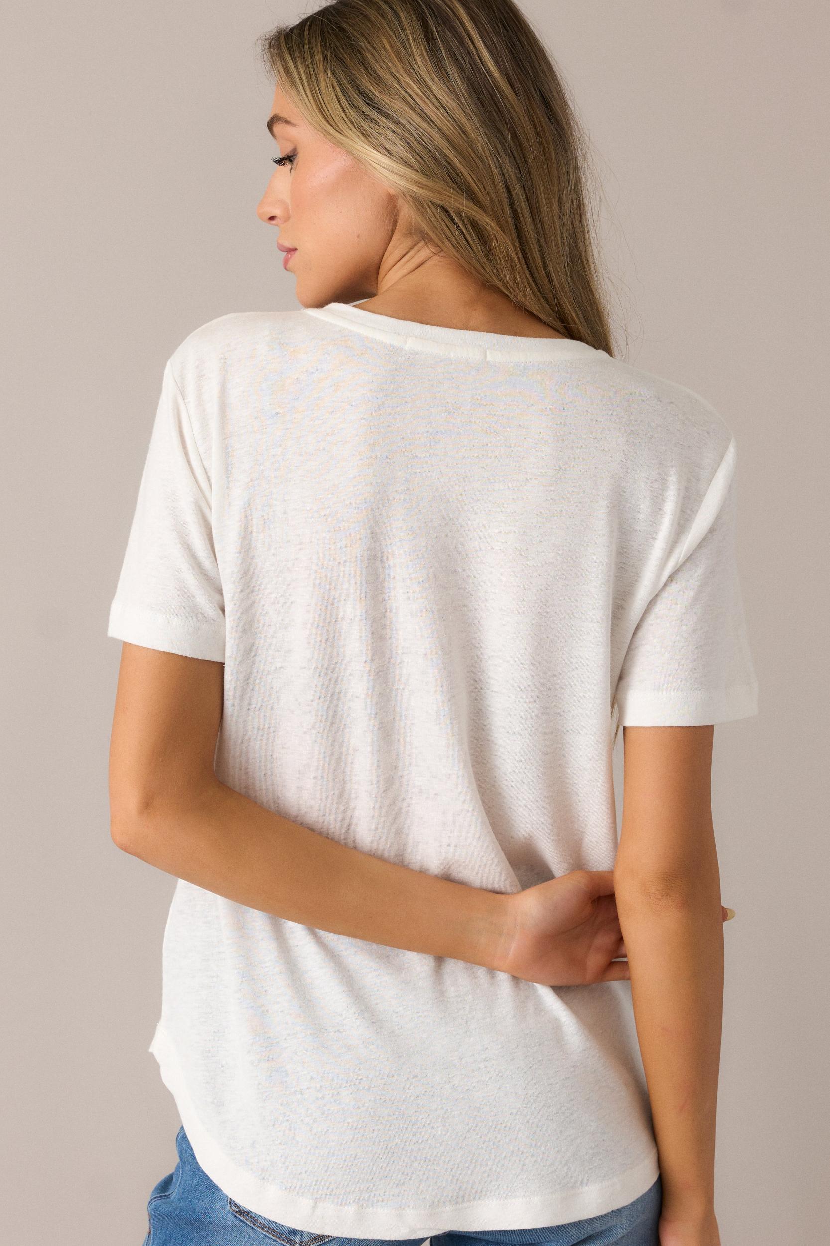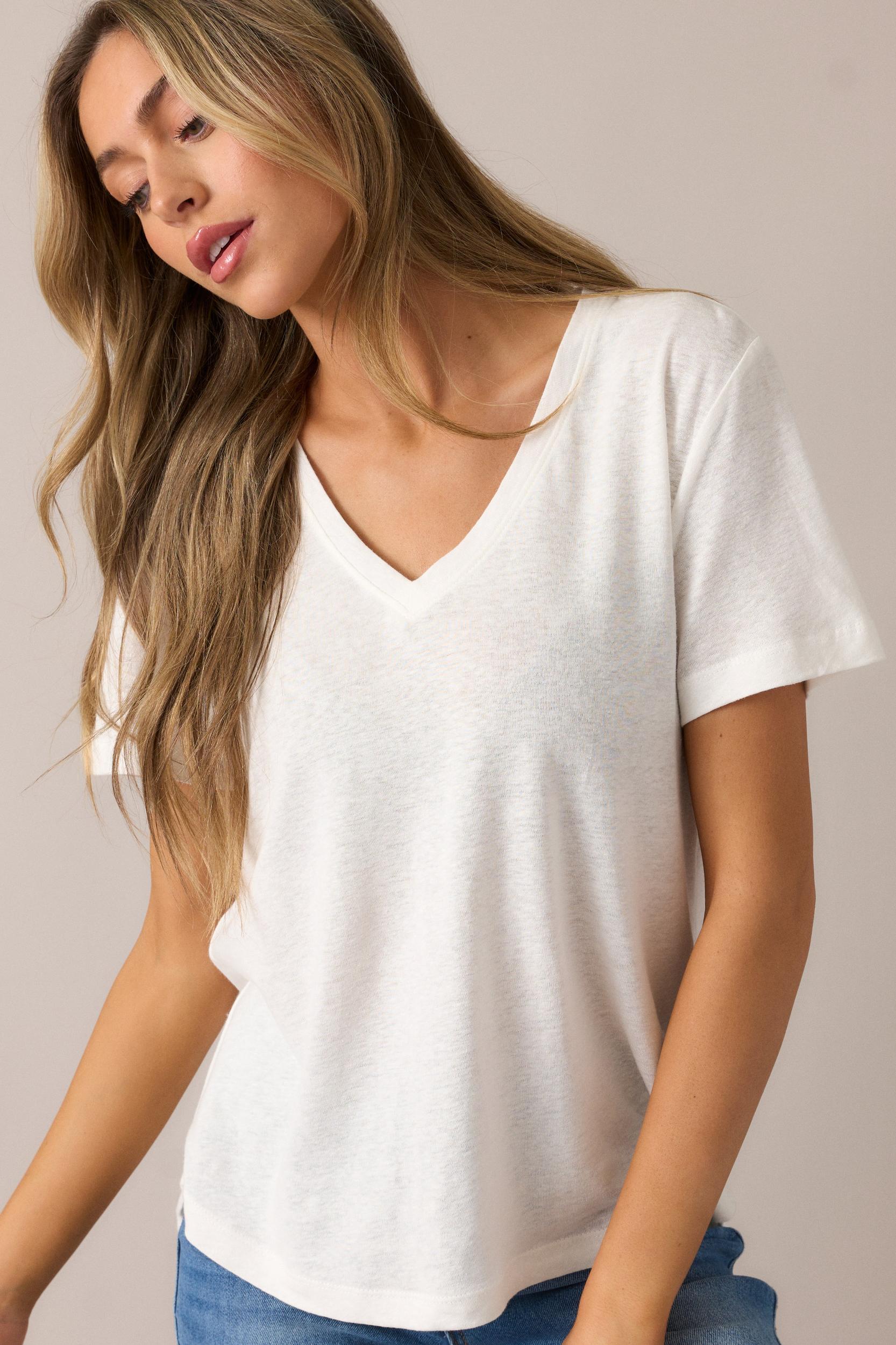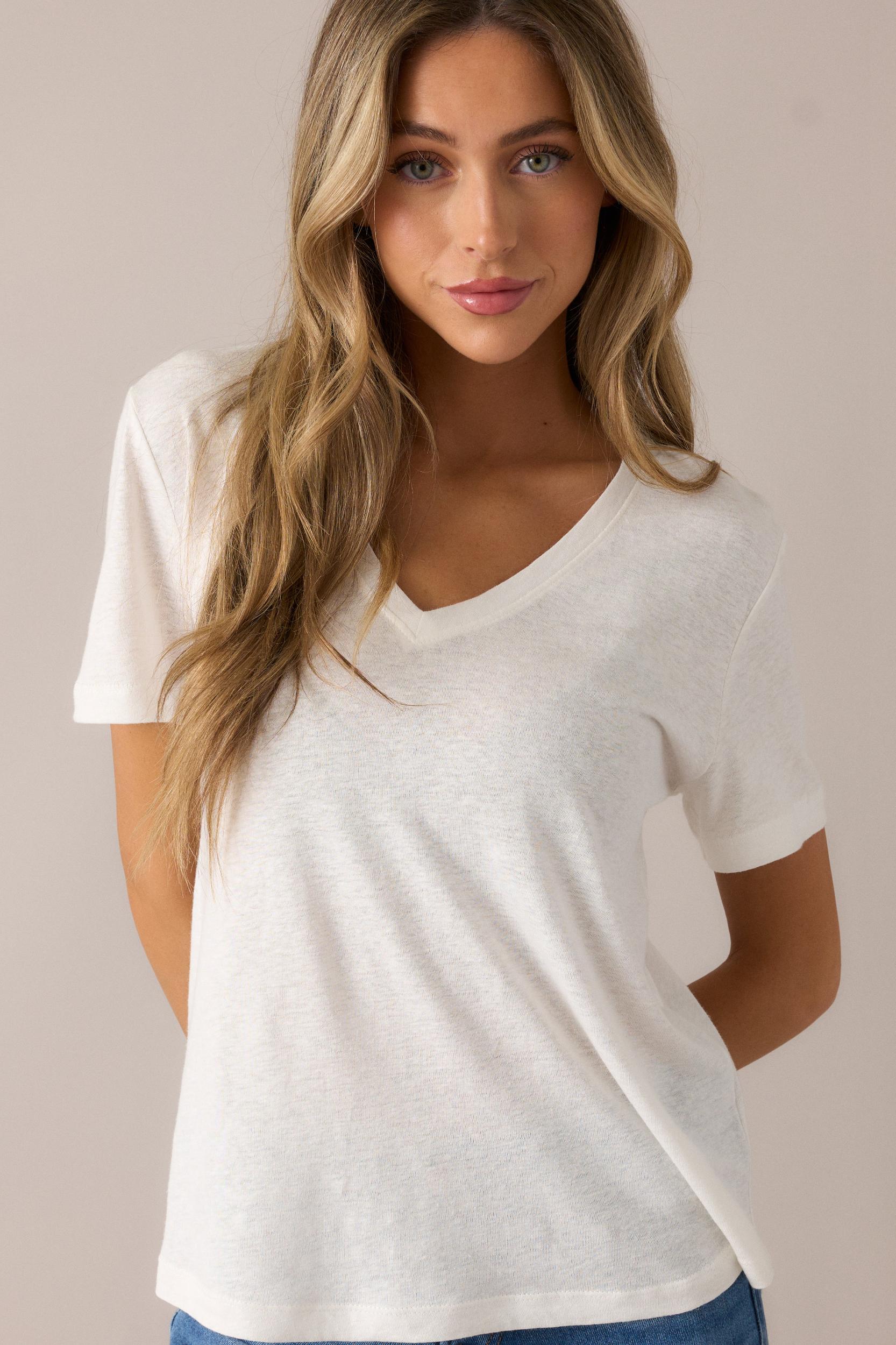 Introducing the All The Way Ivory V-Neckline Washed Tee - the ultimate casual top for any occasion. With a stylish v-neckline and soft washed fabric, this tee offers both comfort and style. Perfect for dressing up or down, this tee will become your go-to piece. Add it to your wardrobe today! This ivory tee features a v-neckline, relaxed fit, washed fabric, a scoop hemline, and short sleeves. 55% Linen, 45% Rayon Unlined Hand Wash Cold Manufactured In China Designed in the USA Model is 5'8" wearing a size small.
