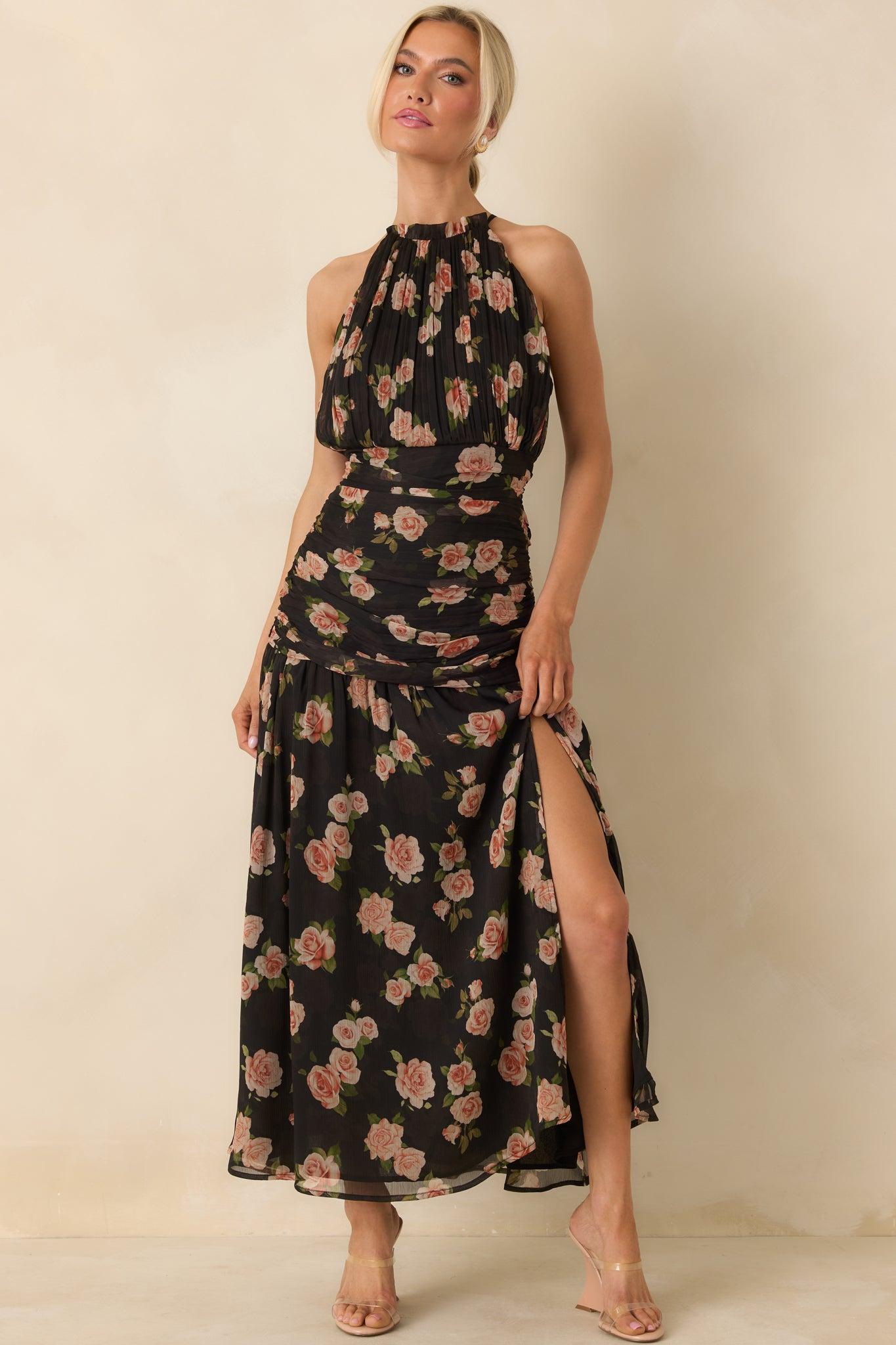Soft florals meet graceful movement in the All This Charm Black Multi Floral Pattern Gathered Chiffon Halter Maxi Dress. Effortlessly romantic, the halter neckline highlights the shoulders while gentle gathering through the bodice creates a flattering, feminine shape. Finished with a flowing skirt and subtle slit, this is the kind of dress that feels special without trying too hard—perfect for evenings out, weddings, or anywhere you want your look to feel naturally elegant. This black chiffon maxi dress features an allover floral print in soft blush and muted green tones. Designed with a gathered halter neckline and pleated texture through the bodice, the skirt flows into a relaxed maxi length chiffon fabric with a side slit for ease of movement. Fully lined through the body for comfortable coverage.100% PolyesterLining: 100% PolyesterHand Wash ColdManufactured in ChinaDesigned in the USAModel is 5'6" and wearing size small, clipped, model is a true x-small