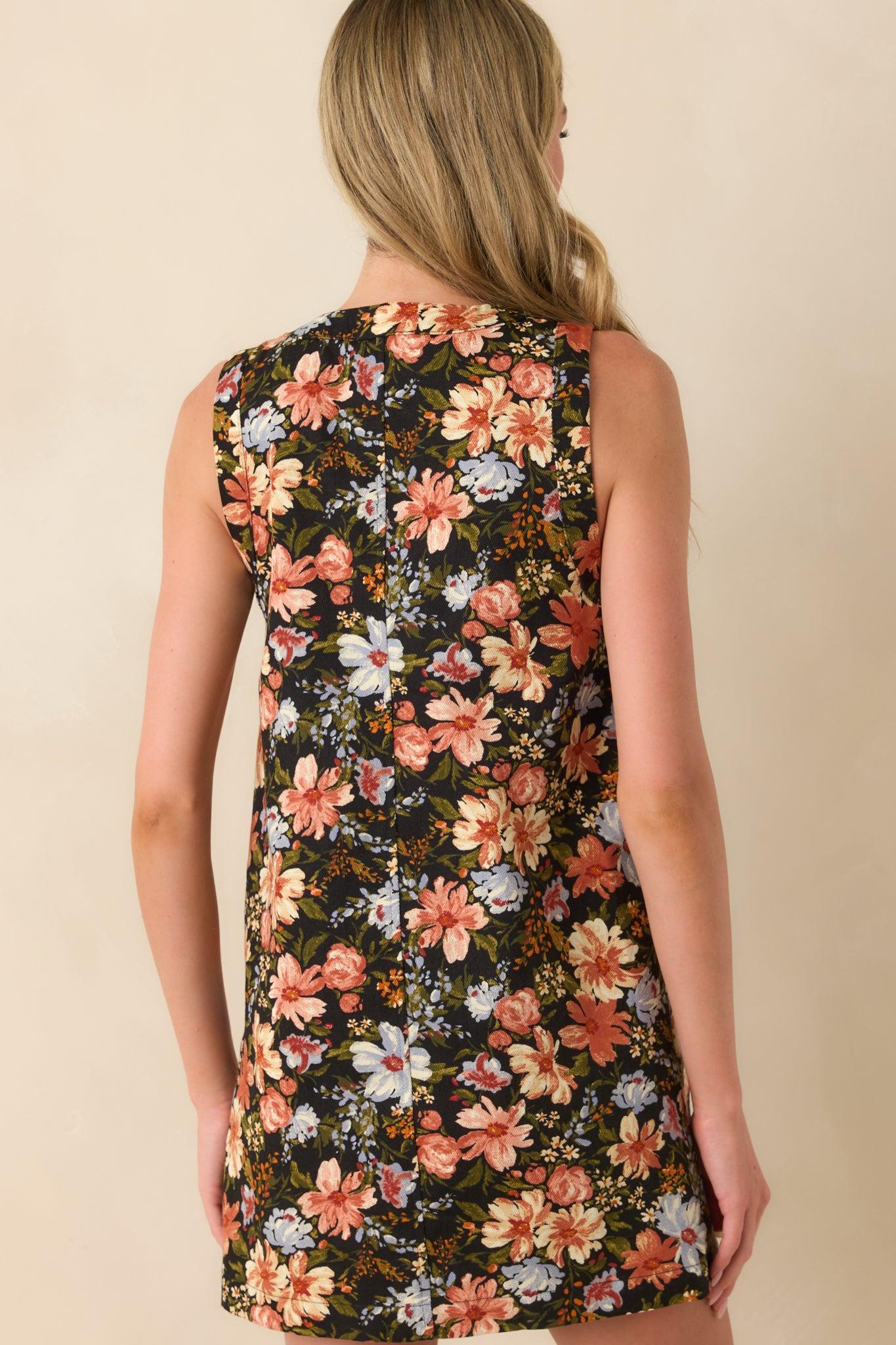 The All This Time Light Rust Multi Floral Print Cotton Mini Shift Dress has that timeless appeal you keep coming back to. It’s chic, stylish, and ready for whatever the day brings. This mini dress features a black background, a light rust multicolor floral print, round neckline, sleeveless design, functional embossed gold dome button front, four functional front patch pockets, and a shift silhouette. 100% Cotton Unlined Hand Wash Cold Manufactured in China Designed in The USA Model is 5'8" and is Wearing a Size Small