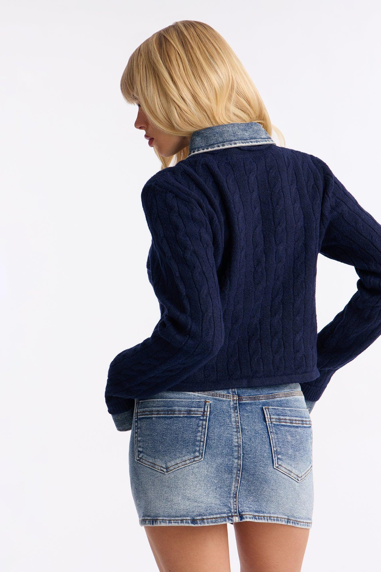 Available In Navy/combo. Cardigan Denim Contrast Hardware Buttons Cable Knit Self: 74% Polyester 22% Acrylic 4% Elastane Contrast: 48% Cotton 27% Polyester 18% Viscose 4% Nylon 3% Acrylic Imported California Proposition 65WARNING: Cancer and Reproductive Harm - www.P65Warnings.ca.gov.
