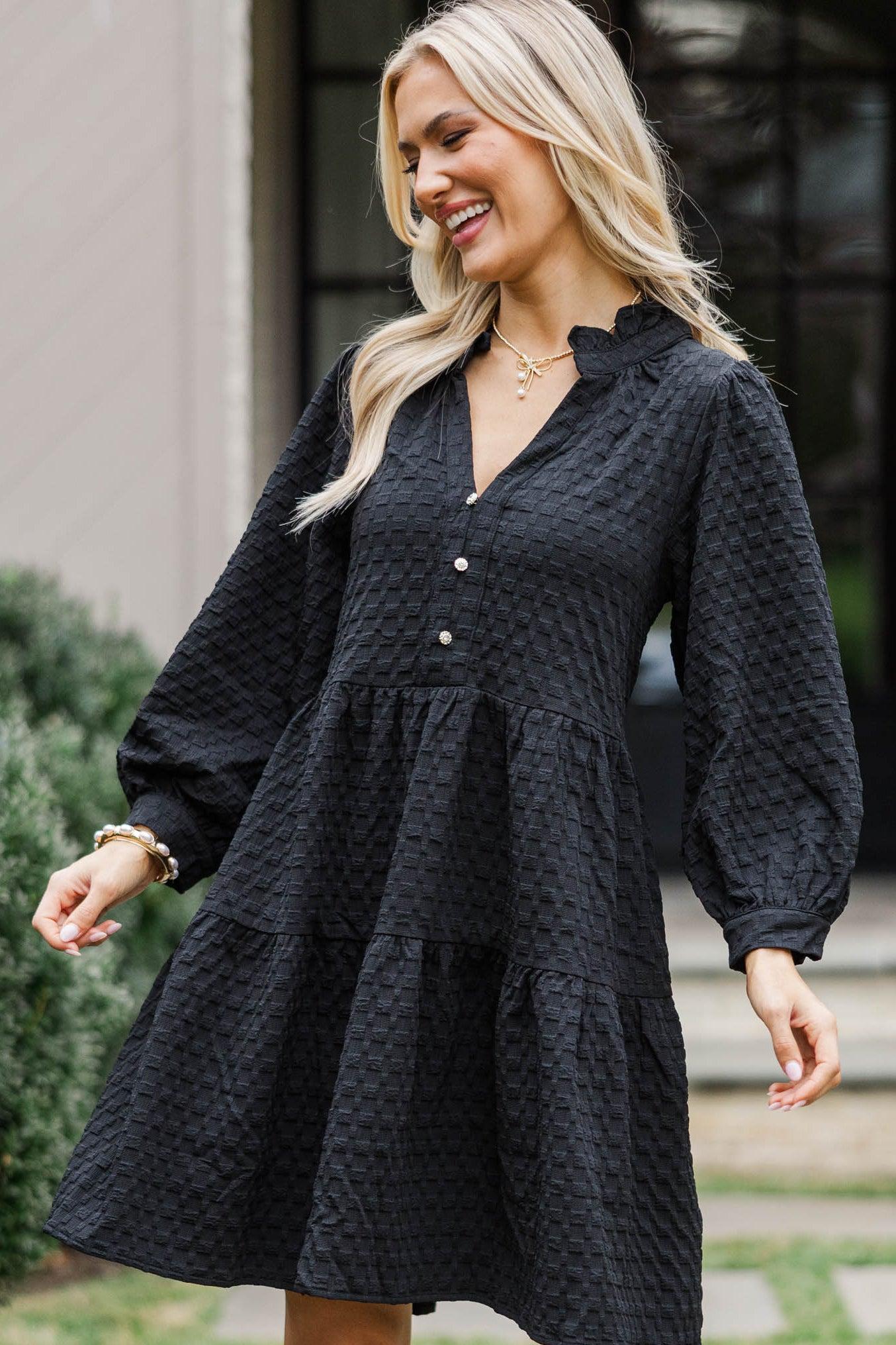 It's all up to you if you want to get your hands on this dress. However, we think you will love it and look fabulous in it! That textured fabric is so chic and we love the classic fit. This dress will style easily for work or date nights. Ruffled v-neckline 3/4 sleeves Textured fabric Decorative button detailing No stretch Payton is wearing the small.