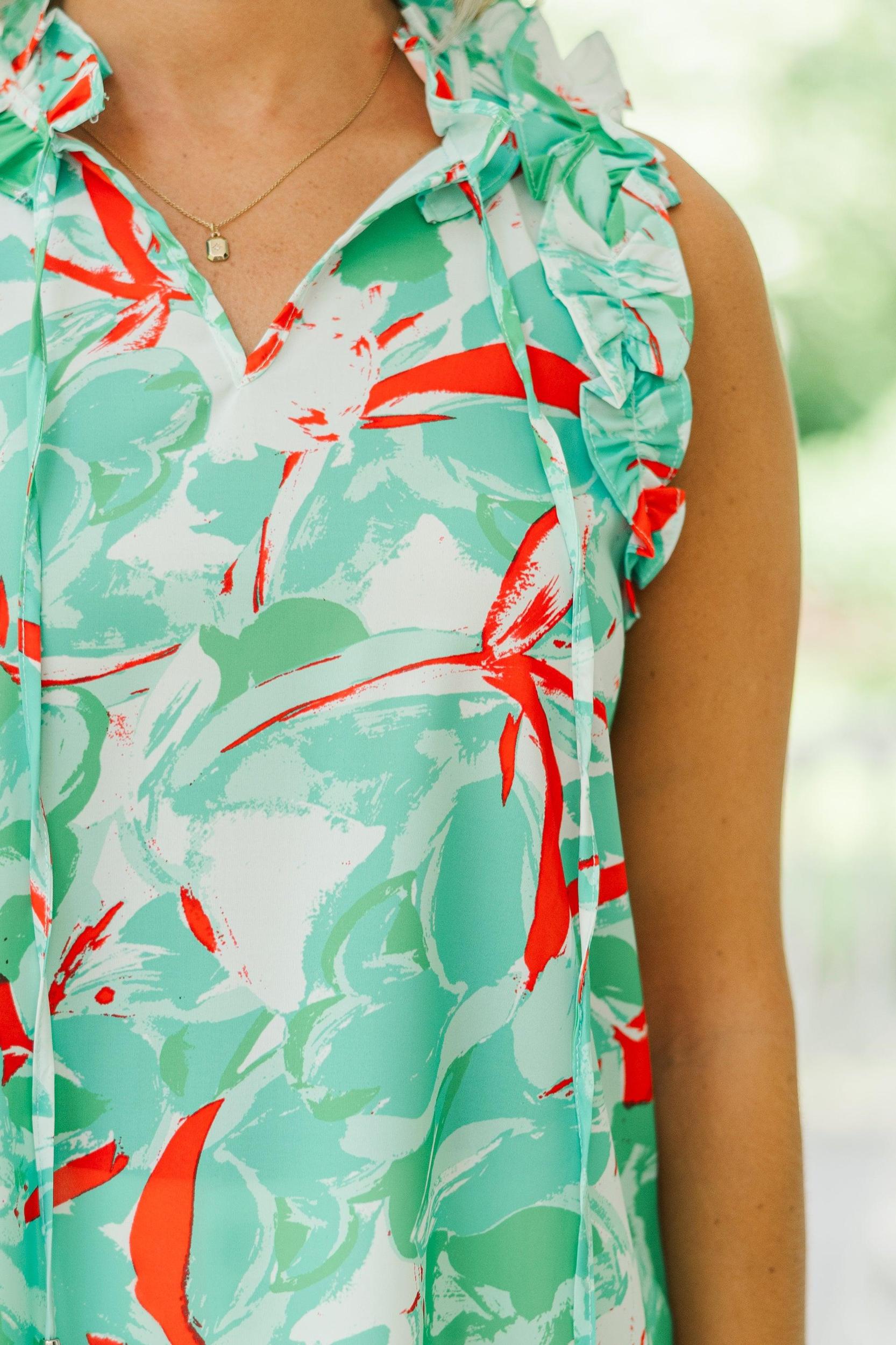 This blouse is so chic and fabulous for the summer! That print and those colors are perfection together! The ruffled detailing is super cute too! This tank will look so good with white jeans and shorts. V-neckline Sleeveless cut Ruffled detailing Floral print No stretch Payton is wearing the small.