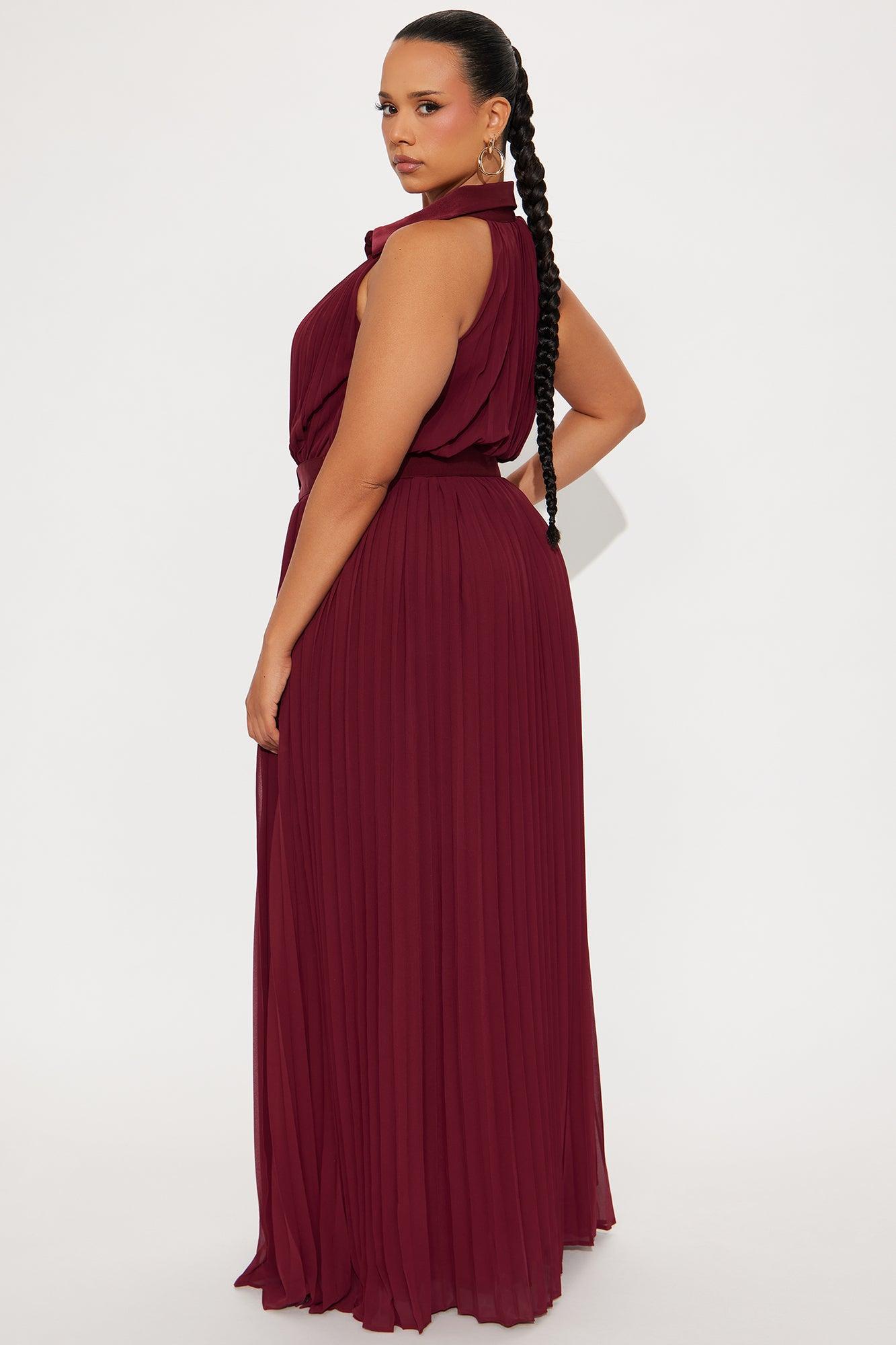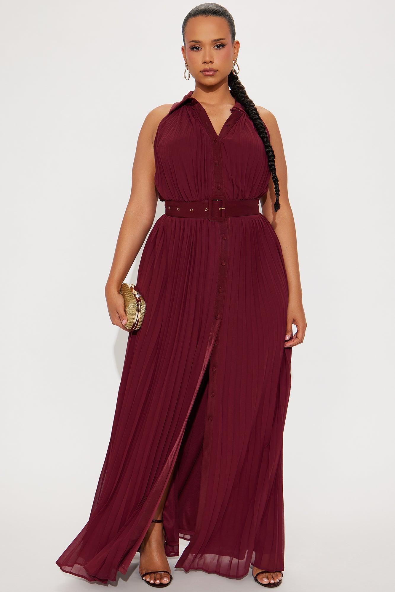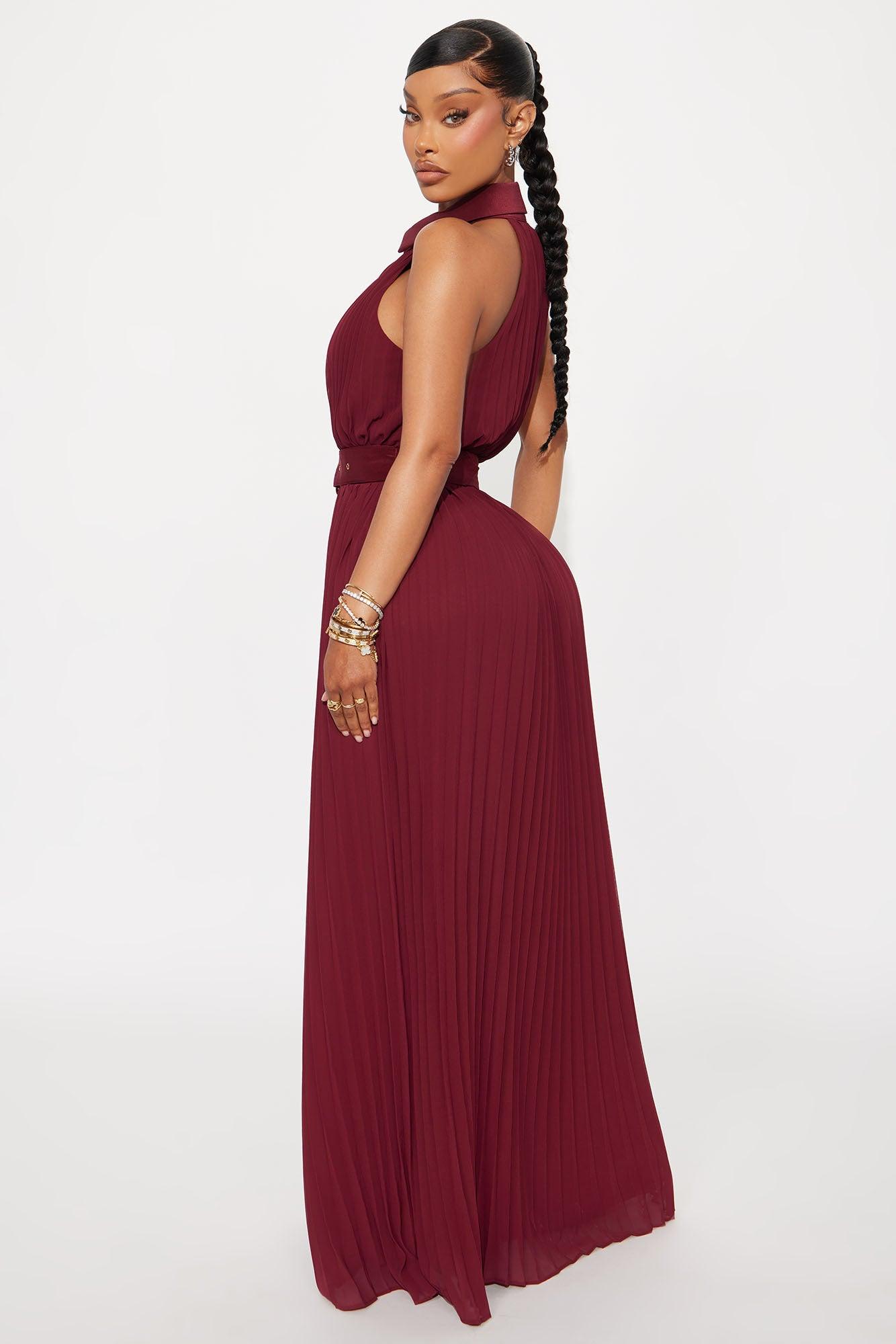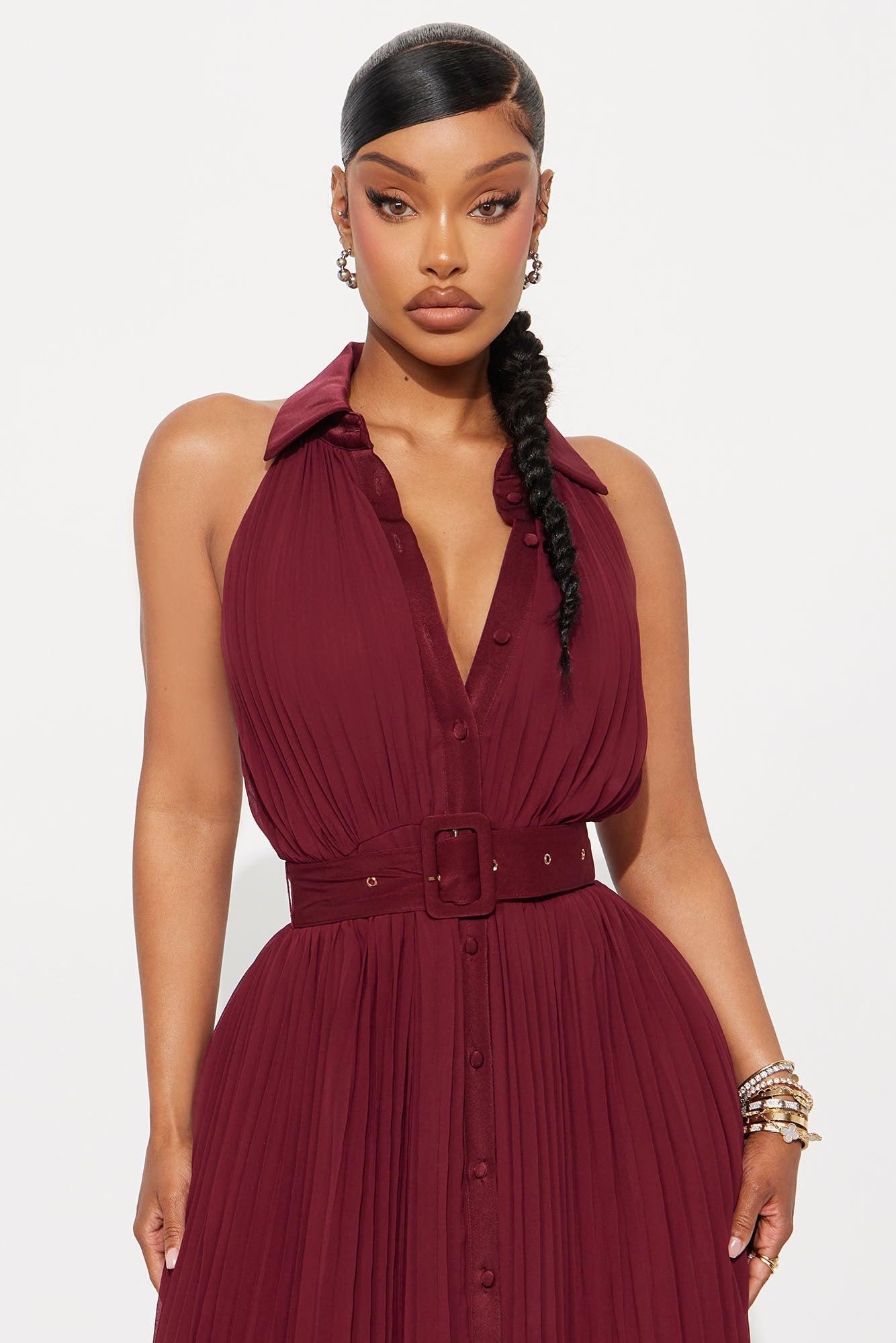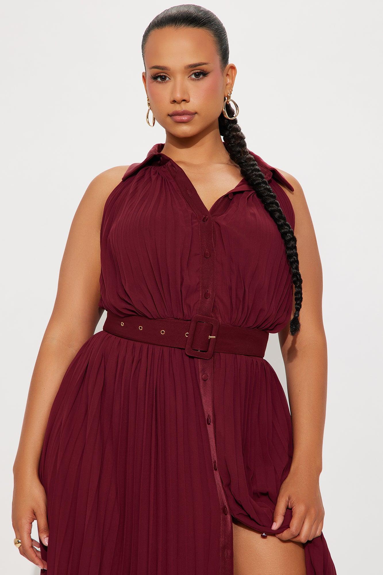 Available In Burgundy. Chiffon Maxi Dress Sleeveless Collar Neckline Button Up Detail Waist Belt Pleated Skirt Detail Lined Stretch Self & Lining: 100% Polyester Contrast: 95% Polyester 5% Spandex Imported California Proposition 65WARNING: Cancer and Reproductive Harm - www.P65Warnings.ca.gov.