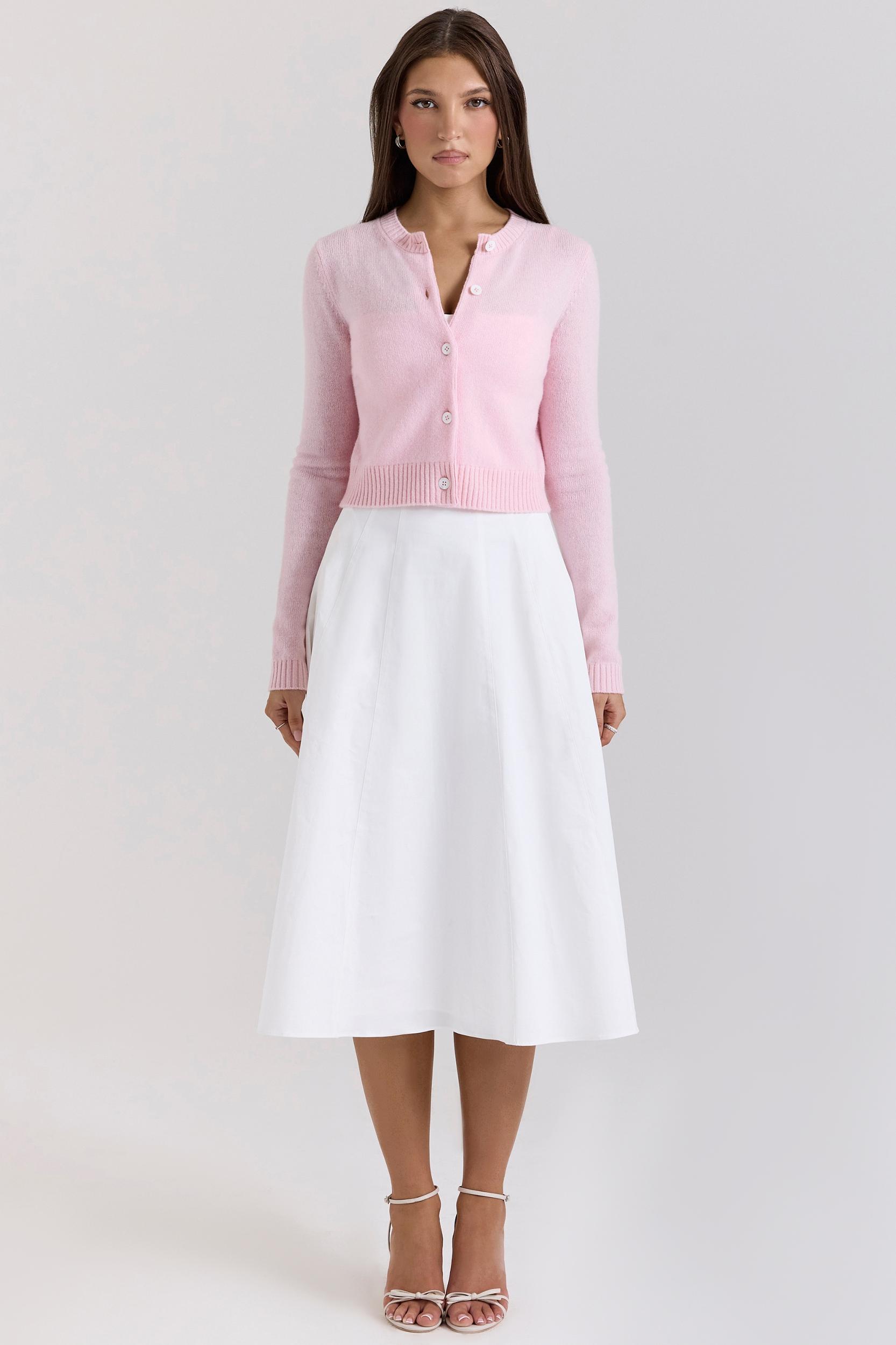 The cutest addition for spring – meet 'Alliana'. Made from the softest 100% wool in an icy pink hue, 'Alliana' is cut to a dainty, ladylike silhouette with long sleeves and a round neck. It's a super cosy cardigan complete with buttons down the front and classic ribbed trims. We're pairing it with jeans and heels for last minute dinner plans, or styling it over a floral sundress when we need an extra layer – you'll have it on hand all-season-long.
