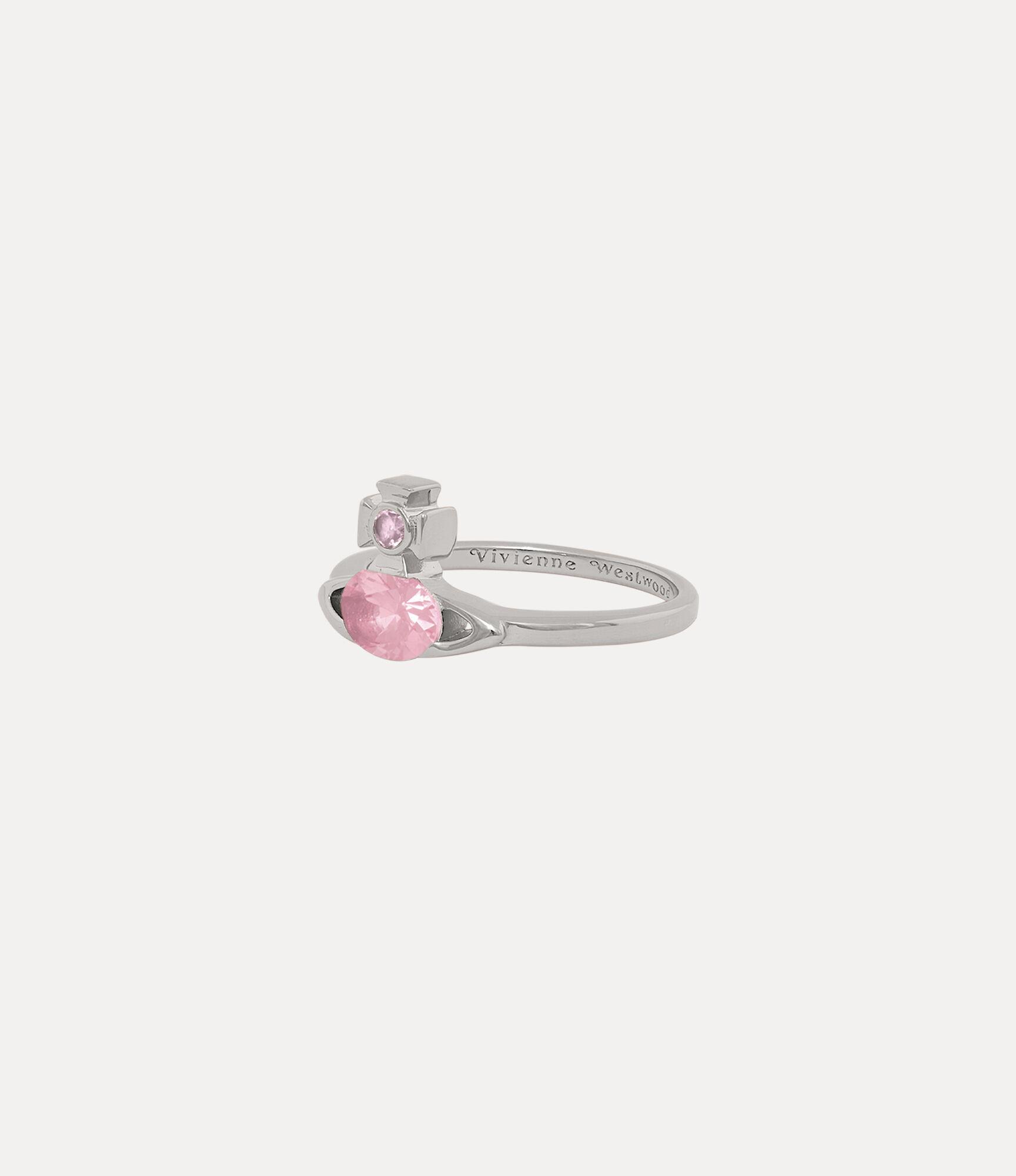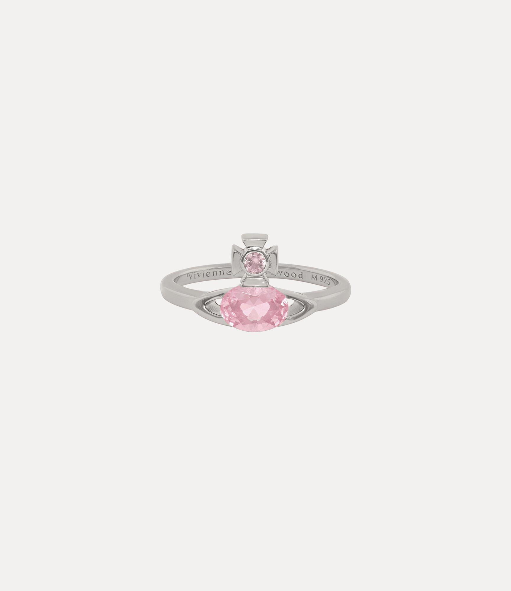 Our Allie ring features a recycled silver profile, enriched with platinum-tone plating. At the centre of the design, an oval pink crystal sits beneath a smaller bezel-set gemstone, forming the iconic orb-shaped face - a symbol of tradition, encircled by the celestial rings of Saturn, which represent the future.