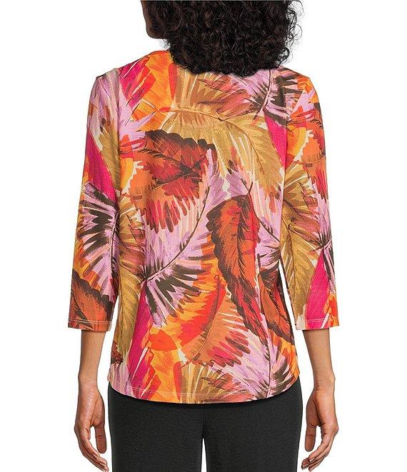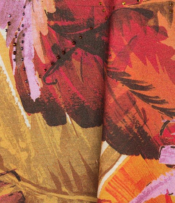 Allison Daley Petite Size Burnt Ochre Leafy Toss Print Embellished 3/4 Ruched Sleeve Crew Neck Knit Top