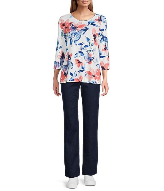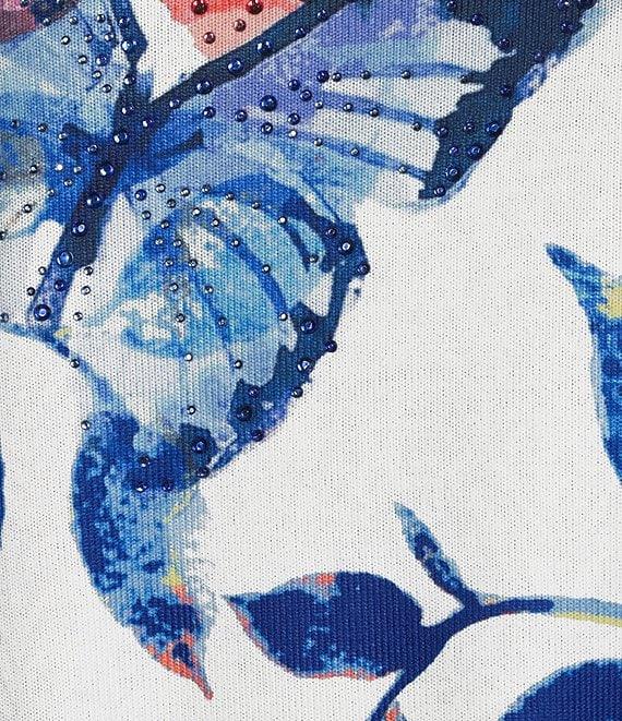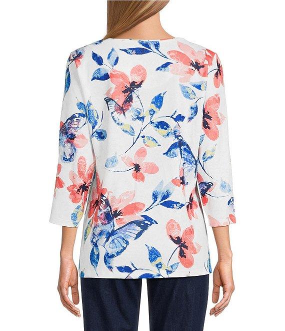 Allison Daley Petite Size Butterfly Floral Print 3/4 Sleeve Crew Neck Knit Top