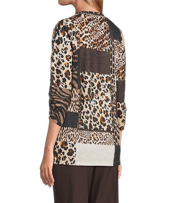 Allison Daley Petite Size Wildlife Patchwork Print 3/4 Sleeve V-Neck Knit Top