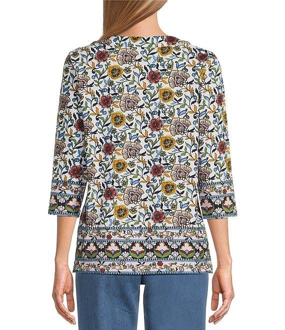 Allison Daley Petite Vintage Bloom Border Print 3/4 Ruched Sleeve Tie Neck Knit Top