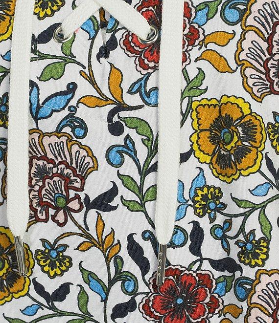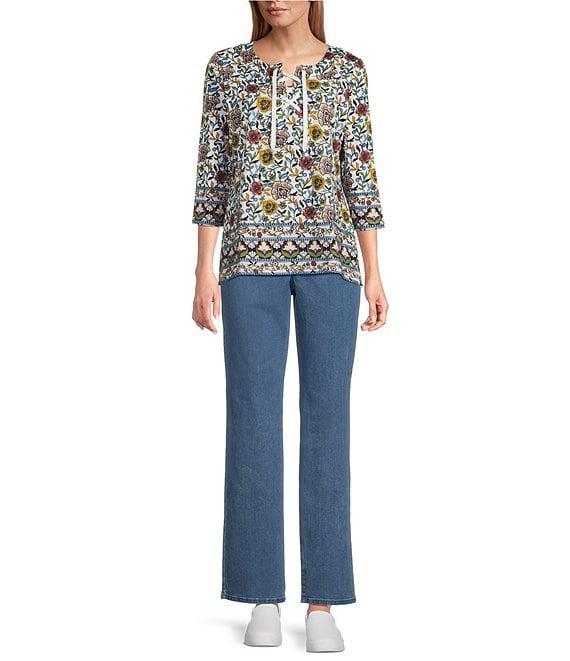 From Allison Daley, this top features: Vintage bloom border Knit fabrication Criss-cross tie neckline 3/4 sleeves Pullover construction Cotton/spandex Machine wash/tumble dry Imported.