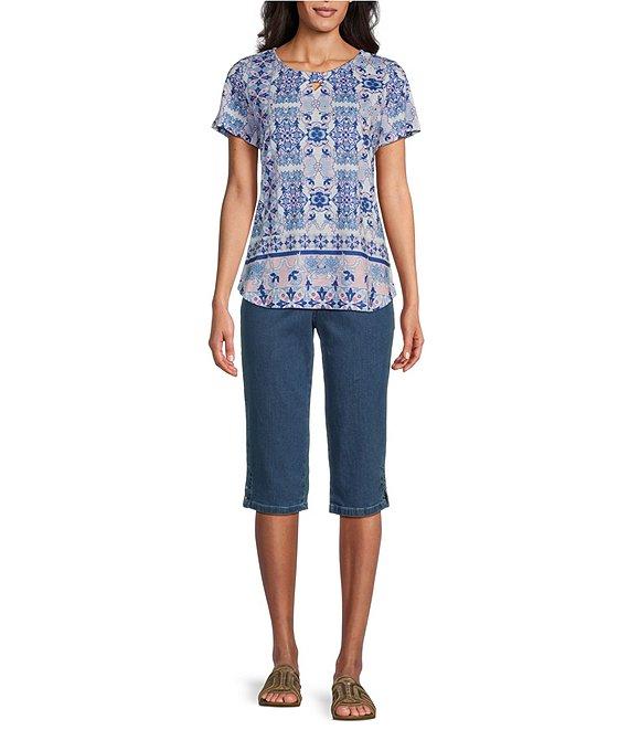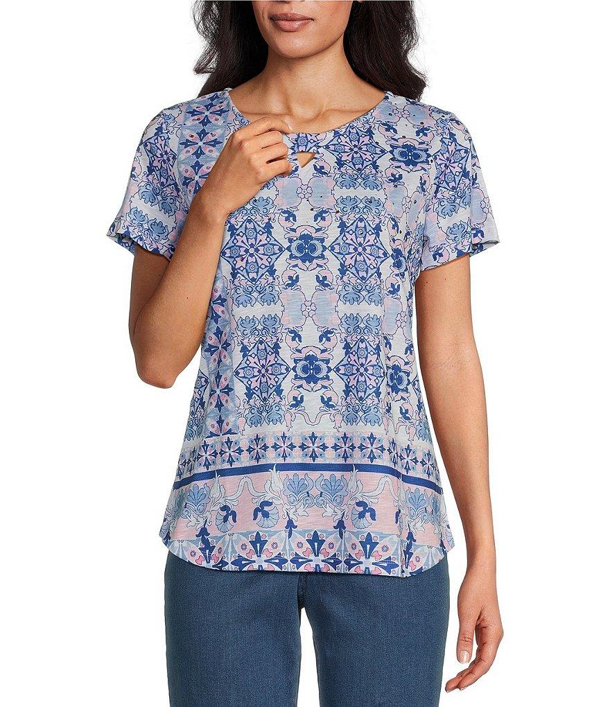 Allison Daley Pink Folk Tile Print Short Sleeve Keyhole Neck Knit Top
