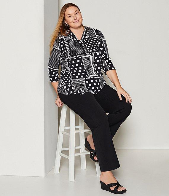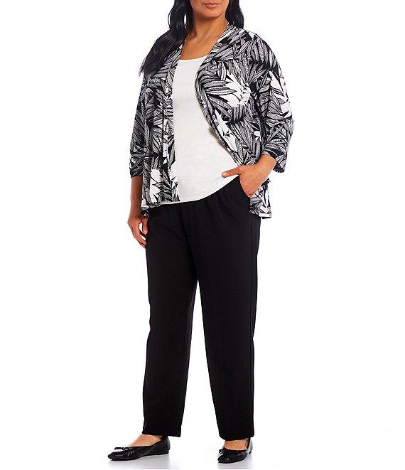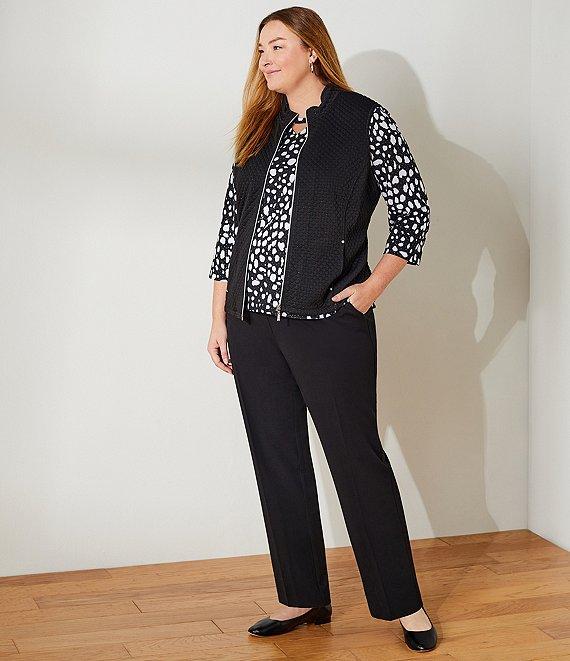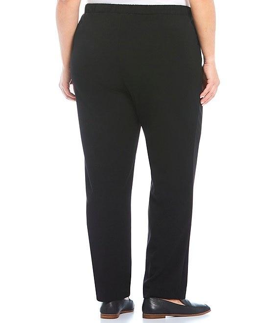 From Allison Daley Plus, these pants feature: city stretch fabrication straight leg silhouette full elastic waistband two front pockets pull-on construction approx: 30" regular, 28" short inseam polyester/rayon/spandex machine wash Imported.