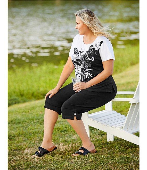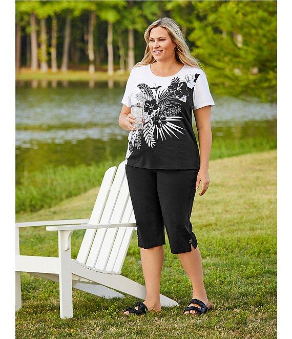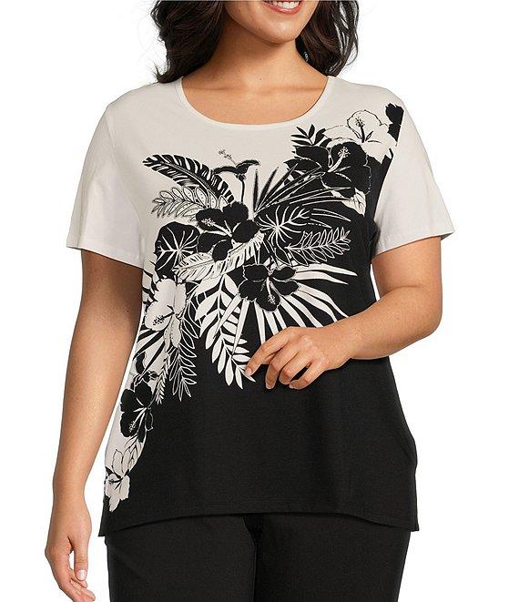 From Allison Daley Plus, this top features: Placed palm print Knit jersey fabrication Crew neckline Short sleeves Pullover construction Embellished detail Side slit hem detail Cotton/spandex Machine wash/tumble dry Imported.