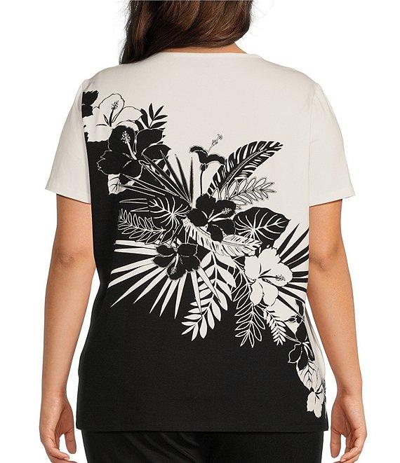 Allison Daley Plus Size Embellished Tropical Palm Print Short Sleeve Crew Neck Knit Top