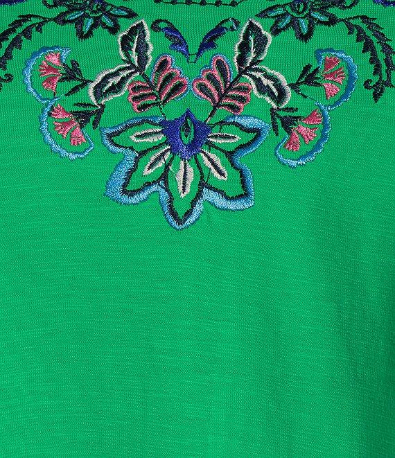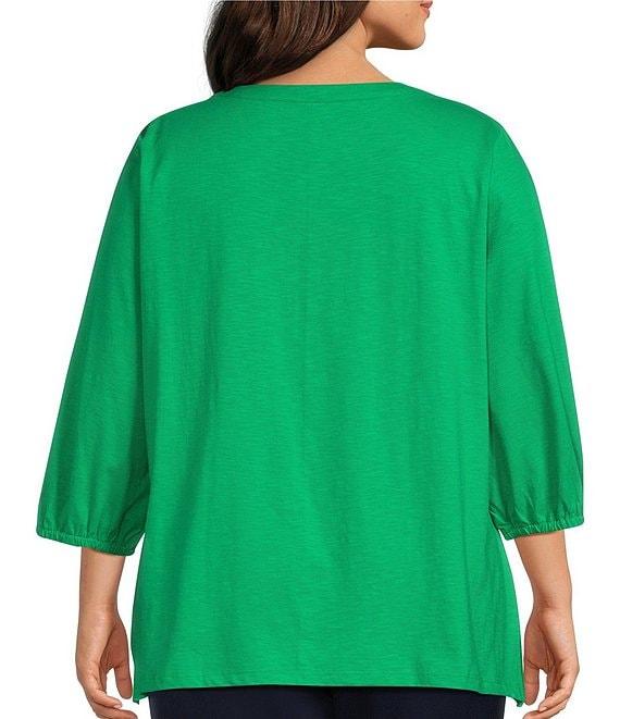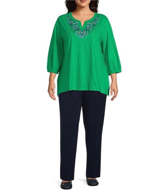 Allison Daley Plus Size Embroidered 3/4 Cuff Sleeve Split V-Neck Top