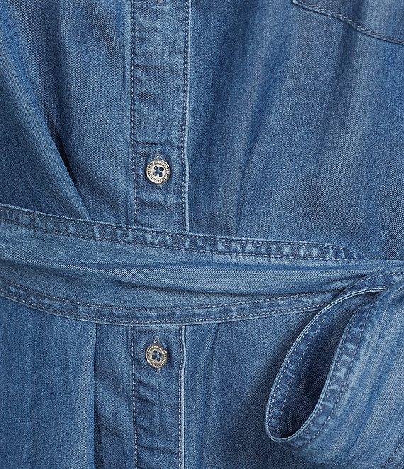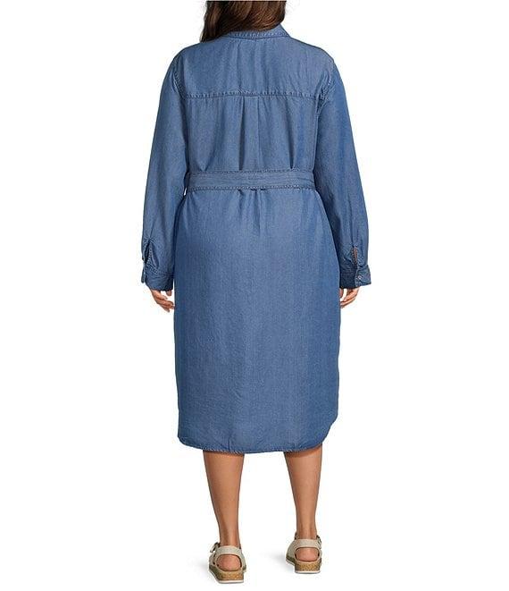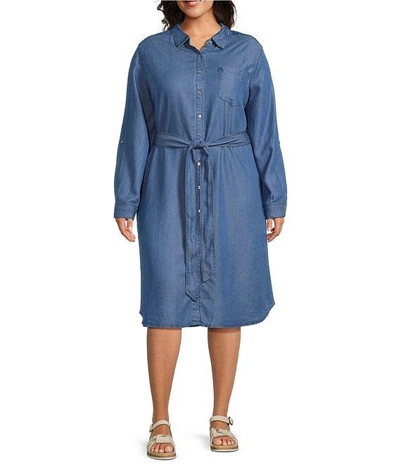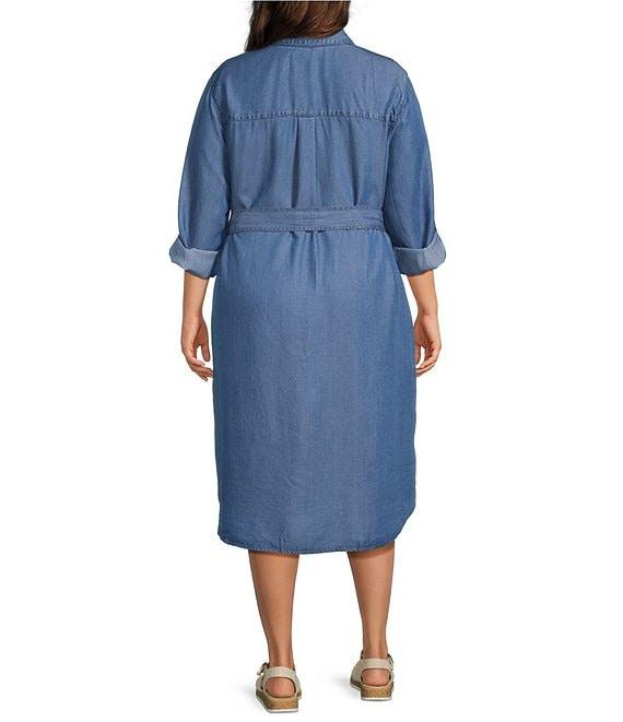 From Allison Daley Plus, this dress features: Lyocell denim fabrication Point collar 3/4 long roll-tab sleeves Tie waist Full button front closure 2 functional in seam pockets Patch pocket at wearer's left chest Approx. 43" length Lyocell Machine wash/tumble dry Imported.