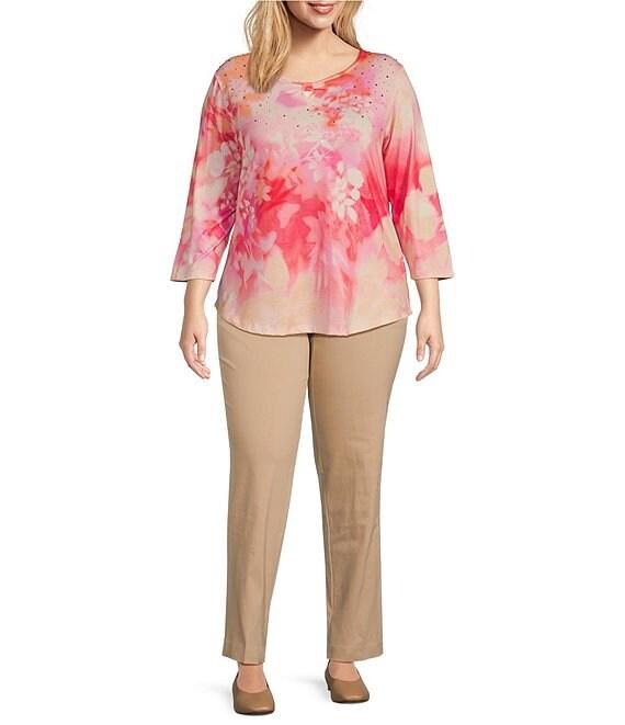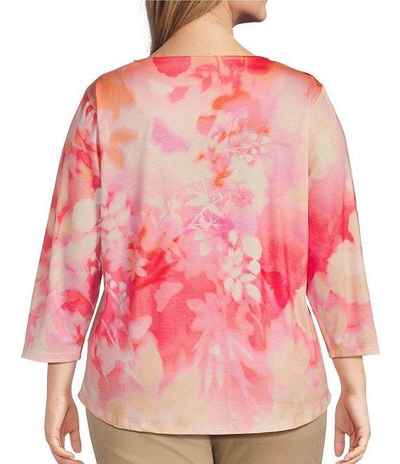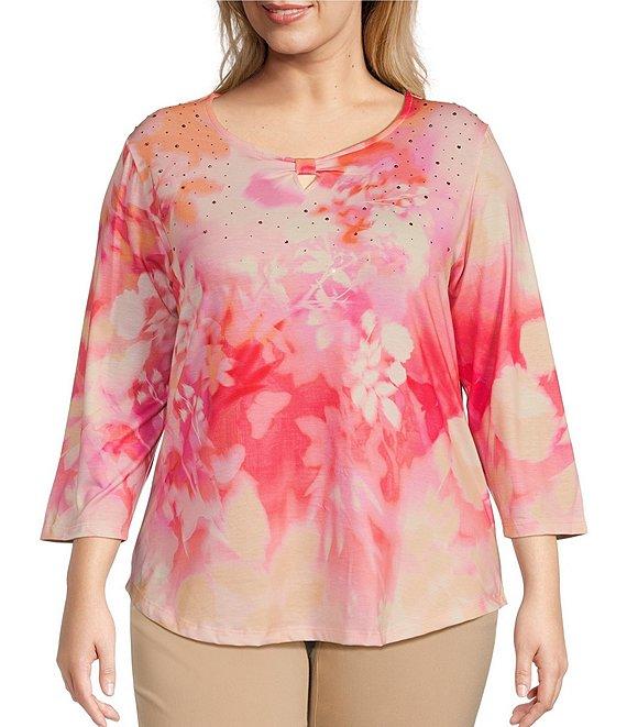 From Allison Daley Plus, this top features: Ombre floral print Knit jersey fabrication Keyhole neckline with knot detail 3/4 sleeves Pullover construction Polyester/spandex Machine wash/tumble dry Imported.