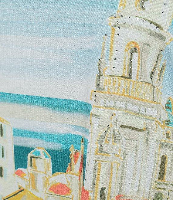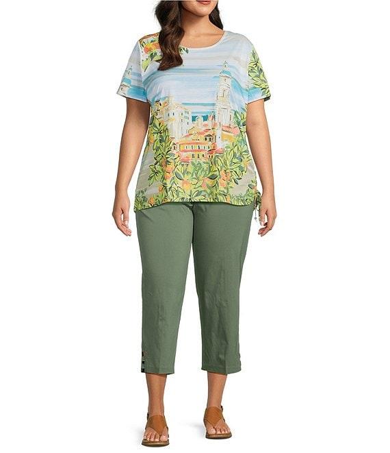Allison Daley Plus Size Tuscan Village Print Short Sleeve Side Ruched Knit Top